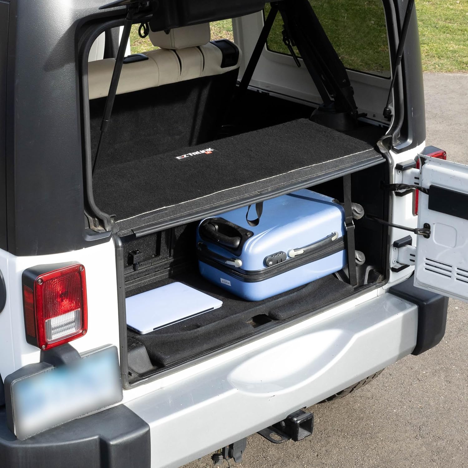 Enhance the security of your Wrangler with our EZTrunk Folding Security Box. The EZTrunk Security Box creates a large and lockable enclosed security space for protecting valuables from being stolen while not having to forfeit precious cargo space with a typical permanent bolt in style trunk. The EZTrunk Security Box NEVER needs to be removed, the patented fold-down design allows you to make full use of your cargo area when needed for those large items, then pops-up in seconds to a fully secured box for all your valuables. A must have when your top or doors are off. Works with soft & hardtop Wranglers and when you’re going topless. No need for extra keys, the box is secured with the vehicle rear door and lock. No drilling required, bolts to your pre-existing tie downs to secure in place. The EZTrunk Security Box is constructed with heavy duty aluminum & fasteners and is finished with a durable textured powder coating.