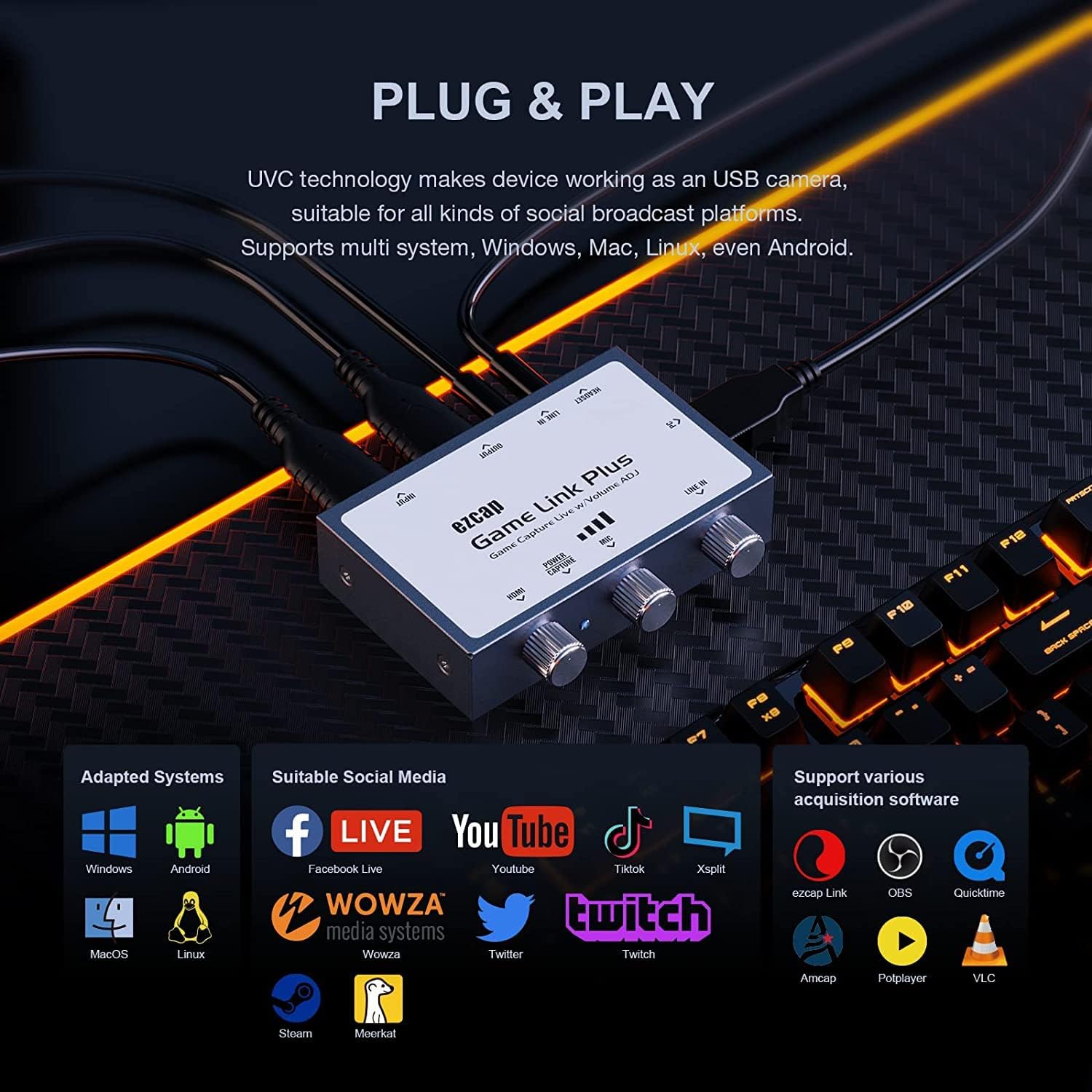 Game Link Pro with Volume Adjustmentezcap312 Game Link Pro is a new generation of high-quality and inexpensive computer video live broadcast artifact. She supports 2160p60 HDMI video input and output, and the highest capture live 1080p60. USB 2.0 interface, normal computer can be adapted. Equipped with CTIA standard headset interface and 3.5mm line input interface to meet general audio input and output. The most special design of the volume adjustment knob, there is no need to rush to adjust the software volume or the device source volume during live broadcast. You can achieve the goal by intuitively adjusting the corresponding volume knob of ezcap312 Game Link Pro.