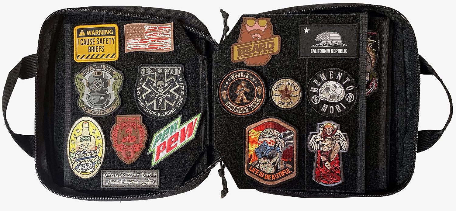 The ultimate way to store your morale patch collection. The F-Bomb Morale Gear Patch book contain 6 double-sided removable hook and loop lined pages. The perfect blend of usability, practicality and durability makes this the ideal home for your prized collection.Overall size: 12”(L) x 10”(W) x 3.5”(H)Fully lined Hook and Loop interiorSix Hook and Loop Lined Removable PagesExterior Zippered back pocket, 5” x 7.5”* Morale Patches Sold Separately
