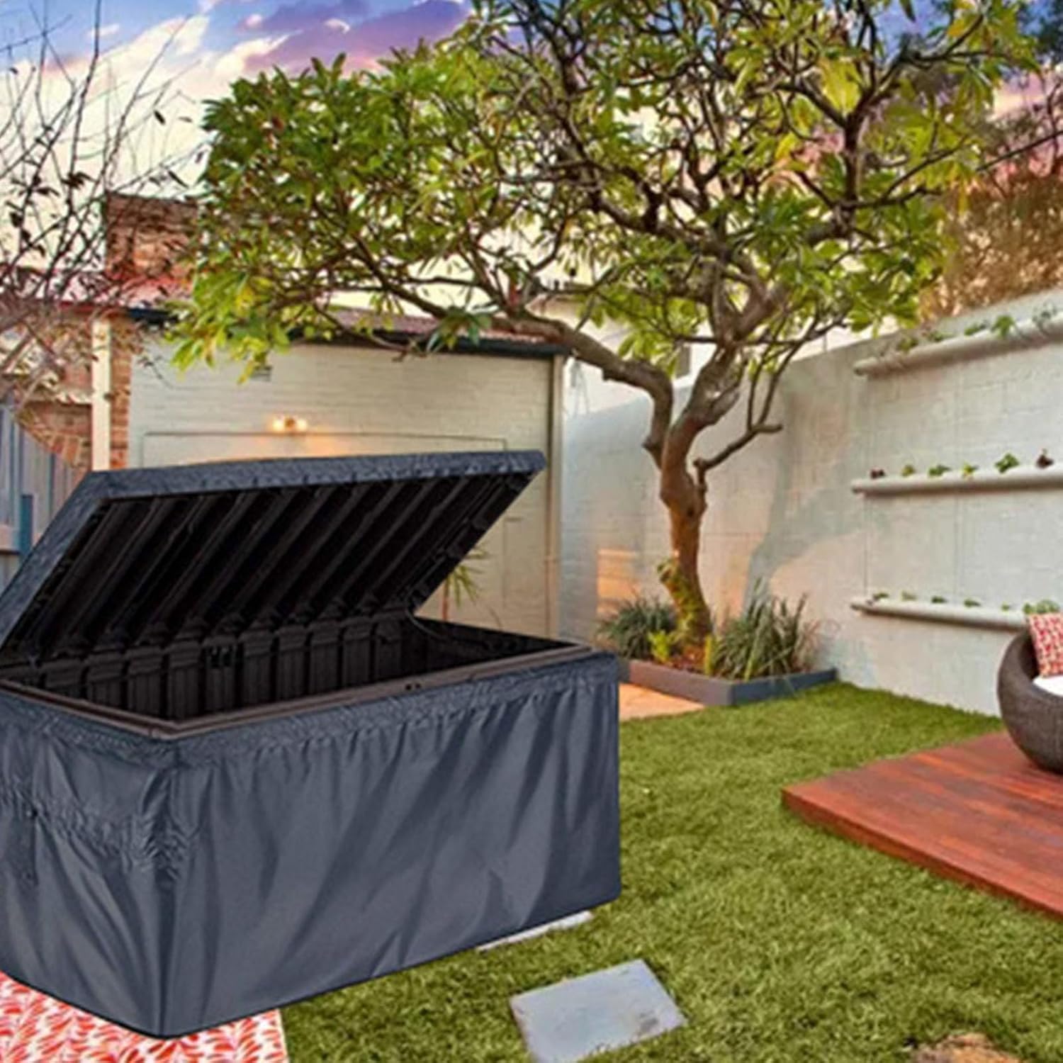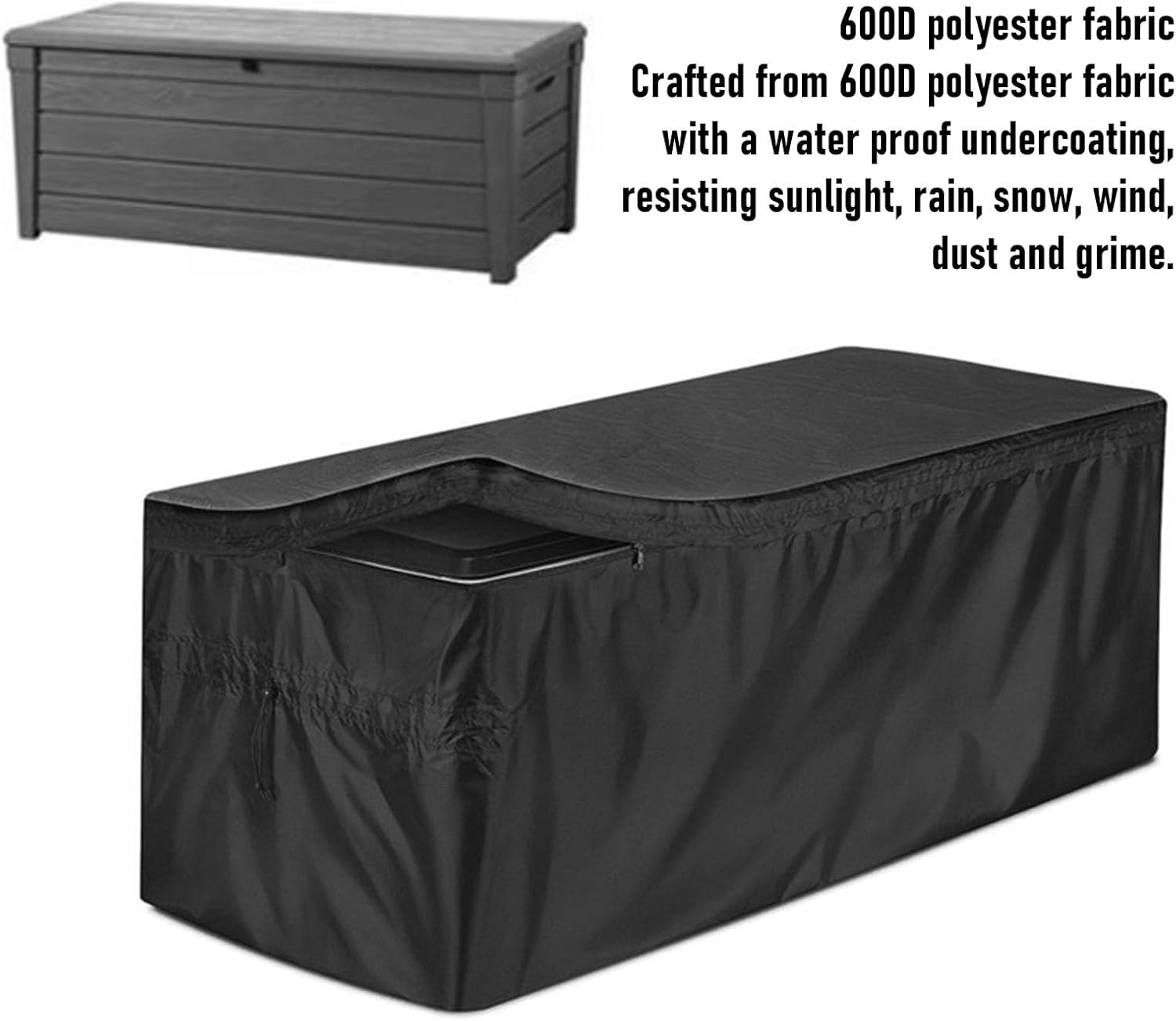 1. Upgraded Material: Crafted from heavy duty 600D polyester fabric with a water proof undercoating, this cover effectively protects your outdoor storage box from sun, rain, snow, wind, dust, and dirt, ensuring your furniture remains dry and no matter the season. 2. Tear Proof And Water Proof Construction: Double stitched sewing techniques combined with sealed seams and tape make this heavy duty rectangular cover significantly more tear proof and water proof. 3. Easy Maintenance: The fabric is both washable and fade proof, allowing for with a simple wipe from a damp cloth or a thorough rinse with water, followed by air drying. 4. Fade Proof, Foldable: The cover will not shrink, fade, or deform when exposed to rain, snow, frost. When not in use, it can be neatly folded into a compact size for efficient, space saving storage. 5. Simple And Secure Installation: This deck storage box cover is exceptionally easy to put on and take off, ensuring a snug and secure fit. This convenient design eliminates the annual chore of laboriously your patio furniture. Specification: Item Type: Deck Box Cover Material: Polyester packing list: 1 x Deck Box Cover 1 x Storage Bag