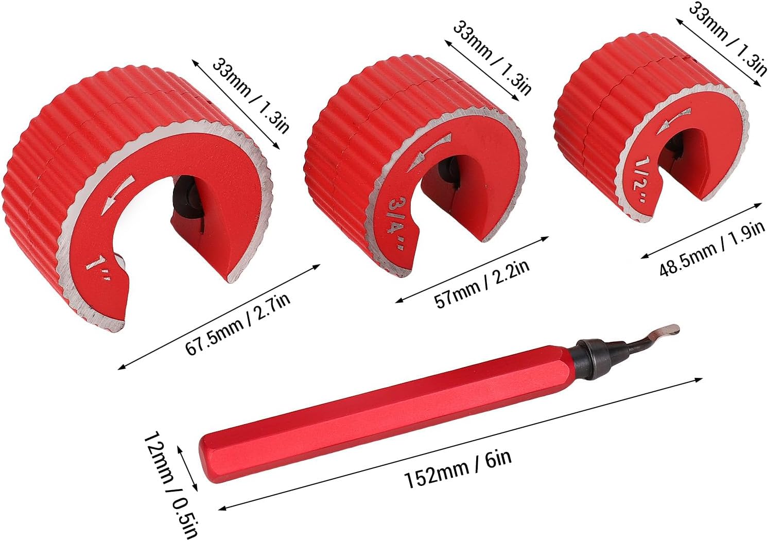 1. Tube Cutter Specifications: This kit includes 3 different tube cutter, with specifications of 1/2 inch, 3/4 inch, and 1 inch, accommodating various types of water pipes to meet all your repair needs 2. Applicable Scenarios: These tube cutter tools allow you to cut pipes to specific lengths, suitable for HVAC system maintenance, refrigerating fluid delivery pipe installation and other projects 3. Metal Material: The pipe cutter is made from high hardness materials, long lasting and wear resisting. The electroplated rollers enhance rustproof performance, extending the service life 4. Compact and Practical: The pipe cutter features a compact design, making it easy to access tight spaces. Includes 3 replacement heads and a deburring tool, catering to a wider range of needs 5. Wide Application: This pipe cutting and deburring set is suitable for PVC, copper, and aluminum pipes, widely applicable to professional plumbing engineering and home pipe repair and repiping work Specification: Item Type: Tubing Cutter Kit Product Material: Aluminum Alloy, Alloy Steel Specification: 1/2 Inch, 3/4 Inch, 1 Inch Cutter Thickness: Approx. 33mm / 1.3in Cutter Diameter: Approx. 67.5mm / 2.7in, 57mm / 2.2in, 48.5mm / 1.9in Trimmer Size: Approx. 152 x 12mm / 6 x 0.5in Package List: 3 x Pipe Cutter 1 x Deburring Tool 3 x Replacement Heads