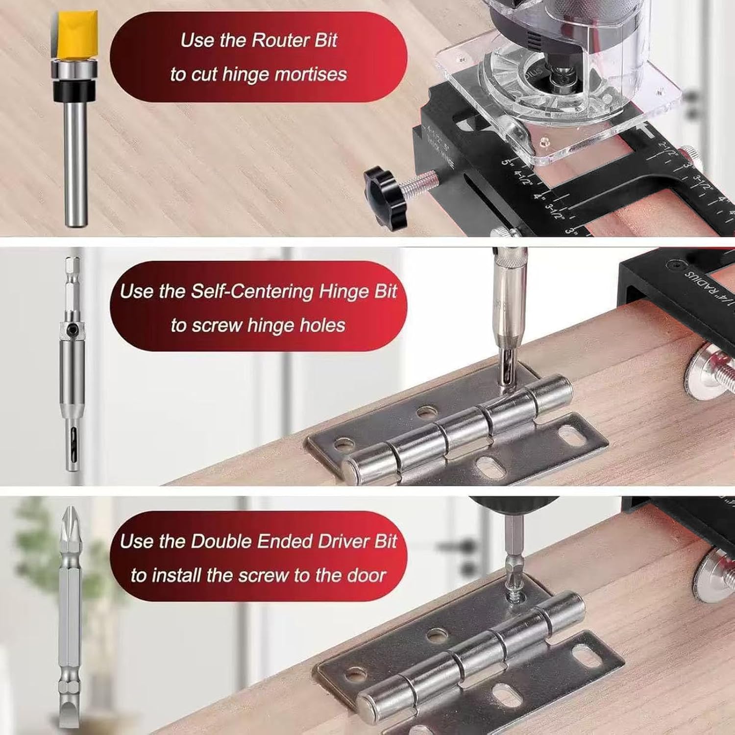 [Professional Precision] Achieve door hinge installations with this premium aluminum alloy router template kit. designed for both hobbyists and professionals, our jig ensures pinpoint accuracy for hinge mortising and slotting, eliminating guesswork. the innovative design guarantees perfect alignment every time, making it ideal for cabinet makers, carpenters, and diy enthusiasts who demand professional results in their woodworking projects. [Versatile Compatibility] Accommodates a wide range of hinge types including 1/4 inch and 5/8 inch radius hinges, plus right angle varieties. cuts clean mortise holes from 2.5 to 5 inches in length, supporting both thick hinges (4-1/2 inch, 5 inch) and thin hinges (2-1/2 inch to 4 inch). this universal compatibility makes it perfect for various door styles and sizes in residential and commercial applications. [Perfect Fit Guarantee] Specifically engineered for standard door thicknesses (1-3/8 inch and 1-3/4 inch) with precise backset measurements (2-3/8 inch and 2-3/4 inch). the intelligent design ensures seamless setup for wooden doors, eliminating frustrating adjustments. whether you're installing new doors or replacing old hinges, this jig delivers consistent, professional-quality results with minimal effort. Spec: Item Type: Door Hinge Jig Kit Product Material: Aluminum Alloy, Silicone Use: Fit door hinges from 2.5 to 5 inch length and thickness, 1/4 inch radius, 5/8 inch radius, and right angle types Package List: 1 x Door Hinge Template Kit 3 x Accessories How To Use: Take out the product and use it directly