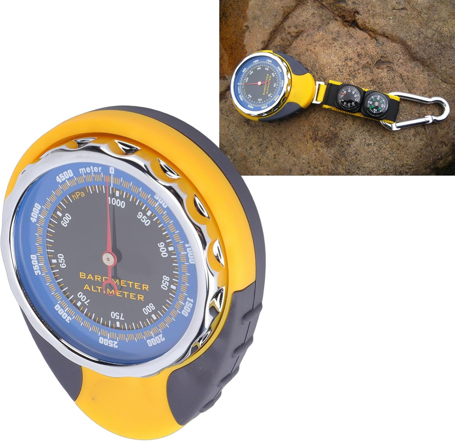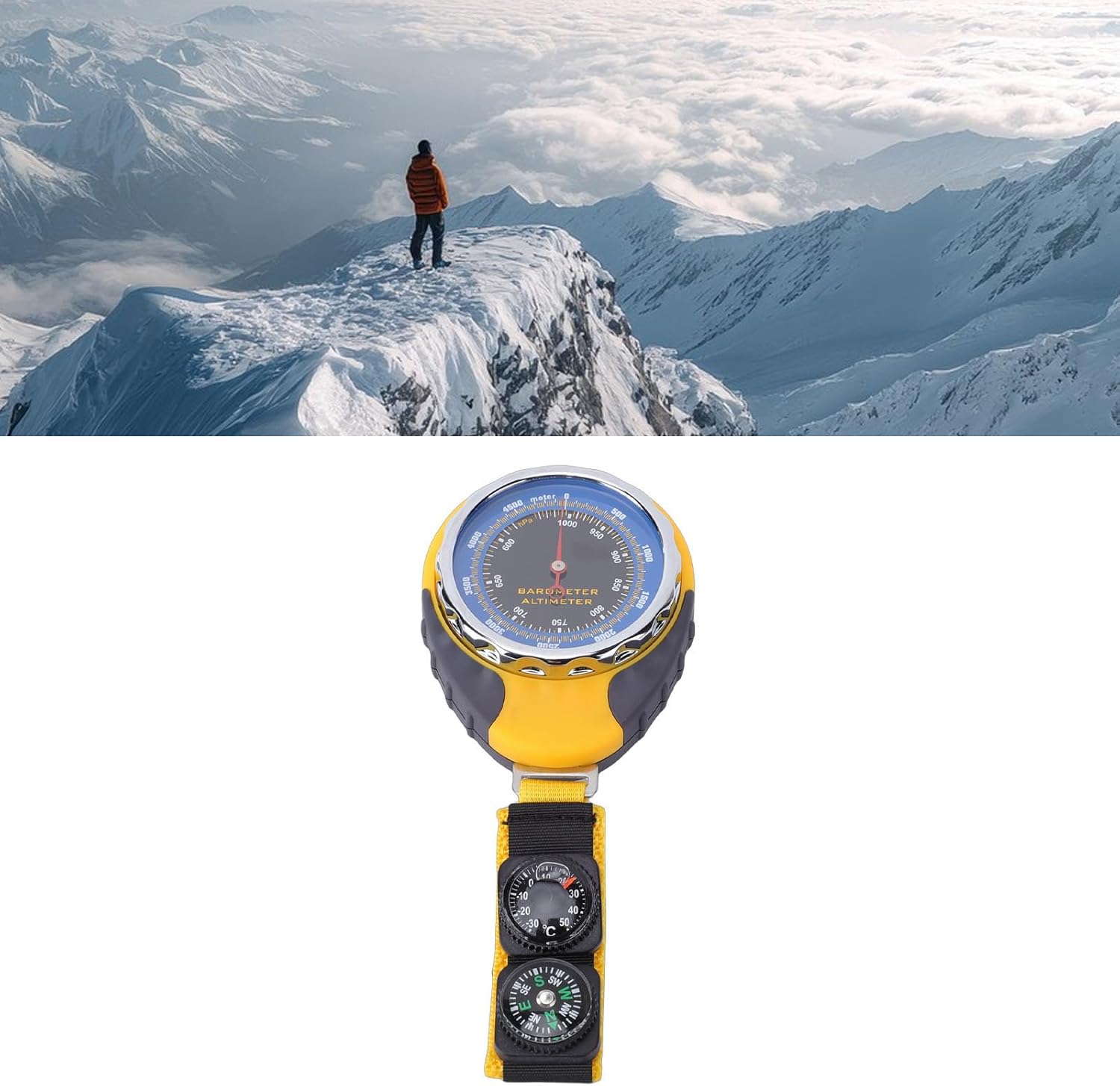 Specification: Item Type: Multifunction Altimeter Product Material: ABS Altitude Measurement Range: 0-5000m Air Pressure Measurement Range: 580-1040hPa Temperature Measurement Range: -30-50℃ Resolution: 20m Dial Size: Approx. 60mm / 2.4in How to Use: Simply use it directly. packing list: 1 x Altimeter 1 x Compass 1 x User Manual