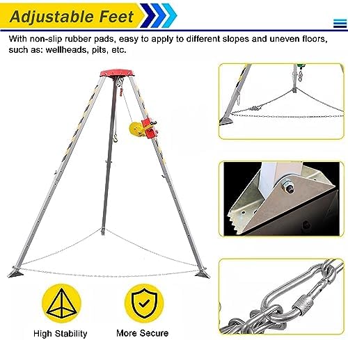• 3,Confined Space Tripod: Adjustable Legs & Feet :: The length of the legs of this rescue tripod stand is adjustable from 1.34-2.14m/4.4-7ft, and it is kept stable by a ring protection chain. The aluminum alloy feet can also be adjusted to suit different slopes and uneven ground.
