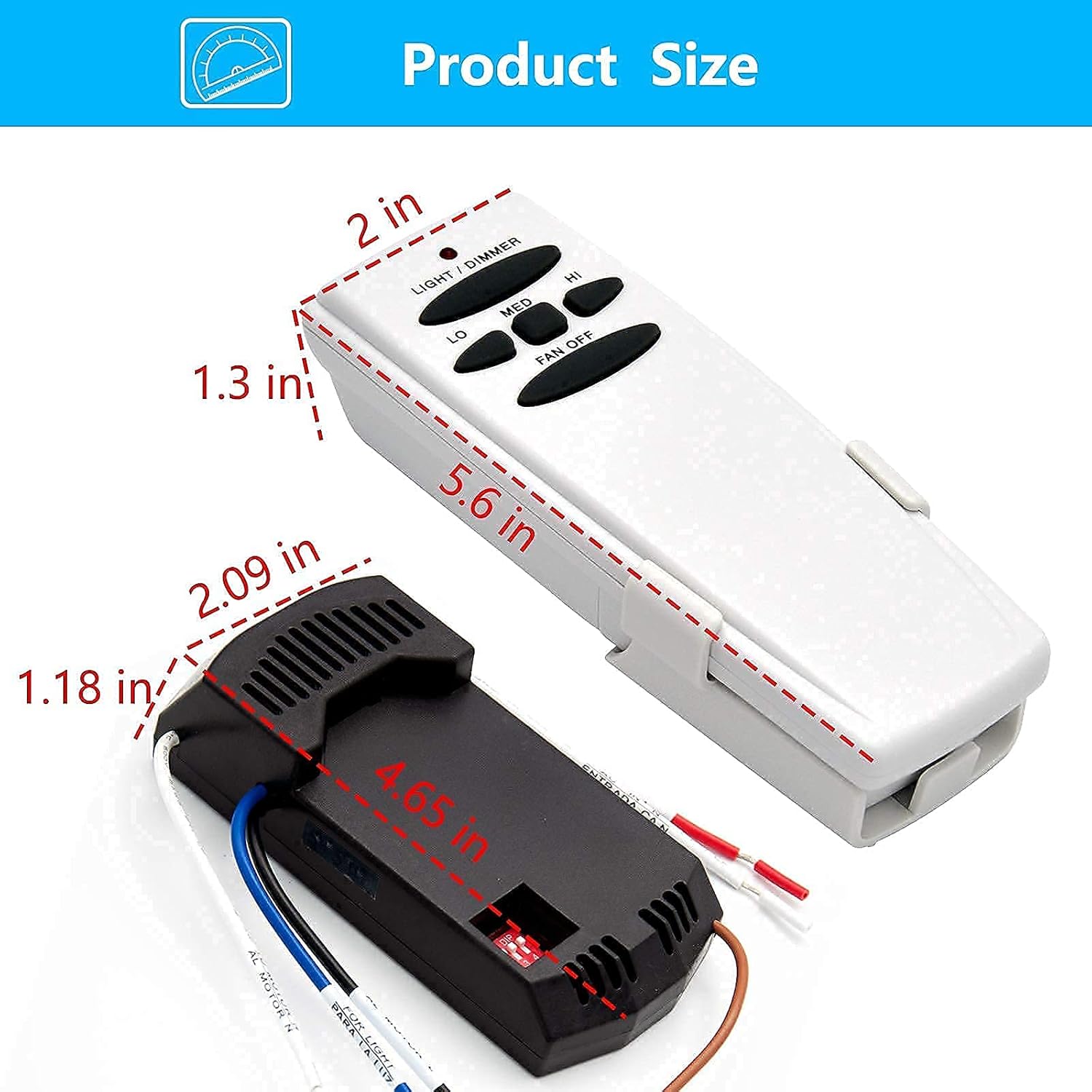 Need to Know Before Buying This remote control kit not have the function of reversal for the fan. The light dimmer is compatible with dimmable LED, CFL, and incandescent light bulbs, non-dimming bulbs only have the on/off function. If your fan have pull chain switch, before using the wireless remote control, use the switch to turn the fan speed to maximum and turn the fan light on. In this way the switch and the wireless remote control can be used together. TROUBLE SHOOTING GUIDE 1. Fails to operate a. Power to receiver? b. Receiver wired correctly? c. Fan manual speed control in highest position d. Light kit switch turned on? e. Good battery in the transmitter? f. Code set at exact same positions in both transmitter and receiver? 2. Won't operate at distance If transmitter operates fan/light kit when up close, but not at 20 feet away. Try placing the brown antenna wire higher, up through ceiling/outside the junction box. FAN28R/FAN-HD Kit Package included: Transmitter * 1 Receiver * 1 Plastic wire connector * 6 Screws * 2 Instruction Manual * 1 FAN-HD Remote Package included: Transmitter * 1 Wall Mount Holder * 1 Screws * 2 Instruction Manual * 1 NOTICE ! Your ceiling fan and light kit assembly must meet the following requirements: 1. Do not use with solid state fans. 2. Electrical rating: 120v 60Hz 3.5A MAX. Motor amps: 1.0 MAX. Light watts: 240-(incandescent or ballast non-dimmer)