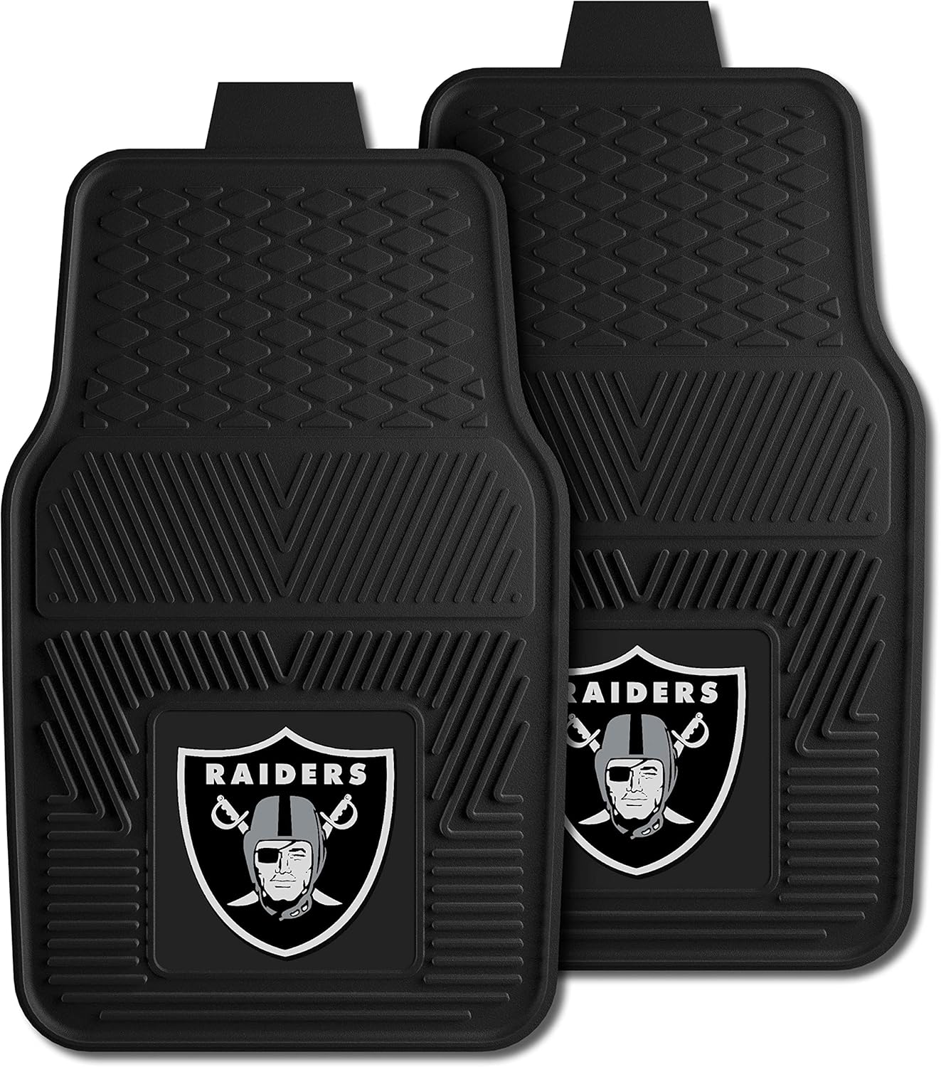 FANMATS 8774 Las Vegas Raiders 2-Piece Heavy Duty Vinyl Car Mat Set, Front Row Floor Mats, All Weather Protection, Universal Fit, Deep Resevoir DesignThe 2 Piece Heavy Duty Vinyl Car Mat Set is our most popular item. Being made entirely from our heavy duty vinyl, these are our most dependable mats they are capable of withstanding any weather conditions. Not only do they help protect you floors, the deep ridges scrape and hold any dirt or debris from your shoes and holds liquid from any spills. Featuring an eye-catching 3D molded logo insert that is 7 inches square, these mats are sure to let everyone know who is your favorite team. Keeping safety in mind, the back of the mats are covered in nibs which keep the mat in place while driving. Knowing that you will want to mats to look new for years, all you have to do is simply vacuum and them wipe down with soap cloth. To try and make these mats fit in as many different vehicles they measure 17 inches wide by 27 inches long.Rico Industries NFL Las Vegas Raiders Standard Chrome License Plate Frame , 6 x 12.25"Trust; it's not a word used lightly these days. Over the last 75 years, Rico Industries has earned an unparalleled reputation for trust and integrity among it's customers. Our Standard Chrome Plate Frame makes a big impact with sleek chrome finish against vivid team name plate and color team logos. Fits all standard plates, measure 6" x 12.25". Pre-drilled holes make this piece easy to hang to your vehicle and is sure to add some more excitement to your drive.