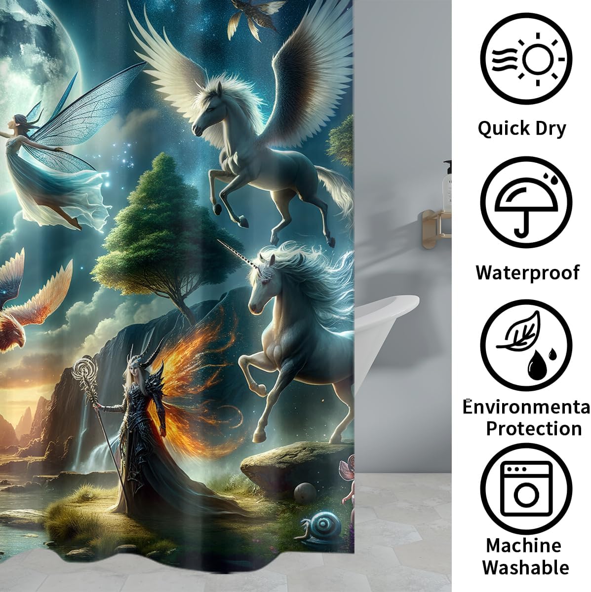 JretailAx Fantasy Enchanted Forest Dragon Patterned 4 Piece Shower Curtain SetsThis Fantasy Enchanted Forest Dragon Shower Curtain Sets 4 Piece liven up your indoor or outdoor spaces with a sense of airiness and beauty.Workmanship & Design:Each Bathroom Sets is machine-made and neatly sewn with no loose threads. Soft,high-quality fabrics ensure long-lasting durability.Beautiful patterns,clever colour matching and advanced printing and dyeing processes for vibrant,fade-free colours.This Vintage Ancient Mid Century Full Moon Wildlife Unicorn Bathroom Sets is suitable for: living rooms,bedrooms,boys' rooms,girls' rooms,nurseries,dining rooms,offices,dormitories,window sills,etc.Care instructions.Machine wash in cold water or hand wash,do not bleach,iron at low temperature.Customer service.24 Hours customer support.