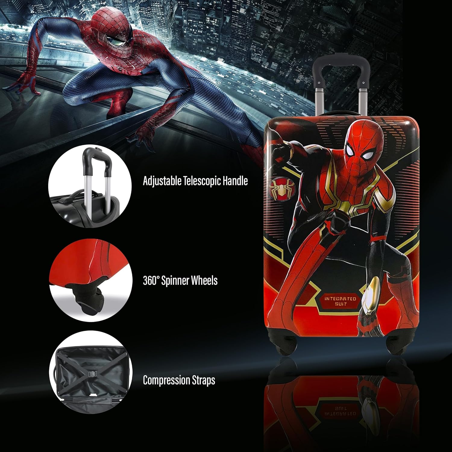 Spiderman no way home luggage, Get ready to travel with this awesome tween spinner luggage case. Your little one is going to love packing and traveling with spiderman no way home luggage. This luggage features your little one's favorite spiderman no way home Characters-Spider-man on the front. The 360° spinner wheels deliver all the durability and smoothness of our full-sized spinner luggage, yet are in a kid-friendly size so they will have no problem maneuvering their luggage through the airport. It has a zipper closure system, that when opened reveals a fully lined interior as well as a zippered divider for internal organization. These cases are also designed to be carry-on approved, saving you unwanted baggage fees while traveling by plane. Perfect gift for a kid on the move. Its hard shell and spinner wheels will make it easy for your little one to travel off to her destination. Perfect gift for a kid on the move. -High-Quality Material - Graphic print on front and solid color on back - Bright color, Lightweight and durable - Four 360° Rotating Wheels for smooth movement - Push-button telescopic pull handle - Inside secure elastic straps - Large Inside compartment, spacious interior - Double zippers - Fully linedFeatures:Brand Name: Spider-man ItemType: Tween Spinner LuggageTarget Audience: KidsShell Material: ABS + Polycarbonate compositeColor: MulticolorDesign: Spider-manCharacter: Spider-ManHeight: 20 InchWidth: 12 InchLength: 8 InchWeight: 4.65 lbsCondition: Brand NewHandle: Retractable Handle