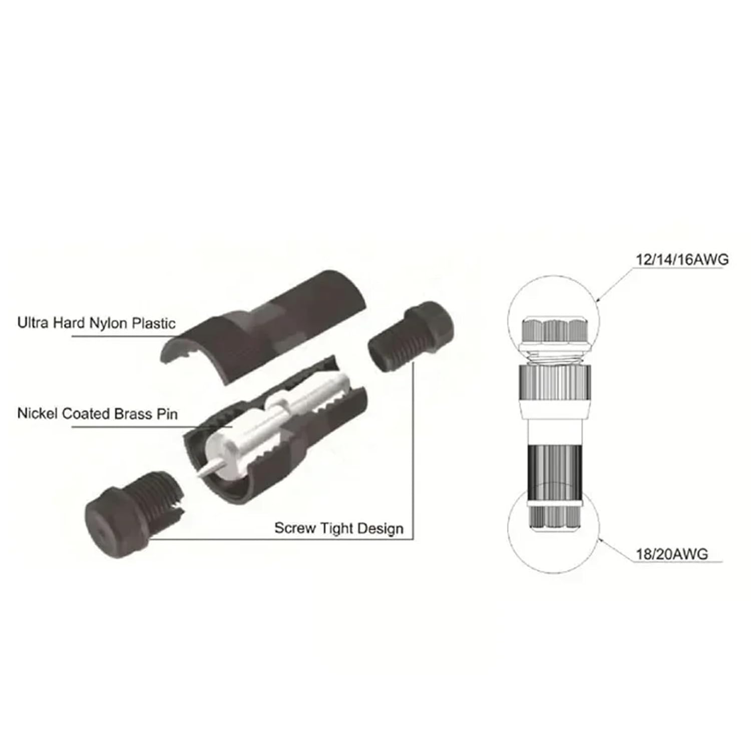 Connectors==========Type : SpliceCertification : CE,RoHSMaterials : Nickel Coated Brass Pin&PA66Power Cord : 12/14/16 AWGLight Cord : 18/20 AWGElectric current : 5-10AVoltage : 12-220V