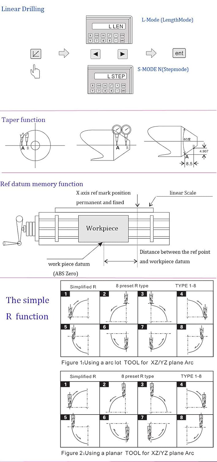 FASTTOBUY 3 Axis DRO Digital Readout uses a glass precision metrology grating as the measurement reference, characterized with high scanning frequency, quick graphic machining and low measuring error. Suitable for lathe, grinding machine, milling machine, boring machine and EMD. ●Shipping list● 1 PC 3 Axis digital readout display 3 PCS Linear Scale 1PC Instruction Manual (English) Accessories:scale cover, L connecting bracket, scale cover, screw bag and so on. ●Specifications of digital readout● Digital Readout Displayer: 2 Axis Distance of Travel(L0): 50~1500mm (please choose the correct linear scale) Resolution: 5um Supply Voltage range: AC 80V~260V; 50~60Hz Power consumption:15VA Operating temperature: 0~45 degree centigrade Storage temperature: -30~70 degree centigrade Relative humidity:Less than 90% Readout allowable input signa:TTL square wave Allowable input signal frequency: Less than 5M Hz Max resolution of digital display length: 5um Min resolution of digital display angle:0.0001/pulse Linear Scale:DB9(RS232) ●Basic Function● 8 bit LED High-definition nixie tube mm/inch mode ABS/INC coordinate conversion zero clearing, reset liner error compensation center of 1/2, R arc function(RAC) vibration filtering, digital filtering sleep mode, divide circle evenly (PCD) 200 sets sub datum function drilling of oblique line taper measurement ●Special Functions Linear drilling PCD function Chambering Tool conpensation Machining of oblique plane Calculator