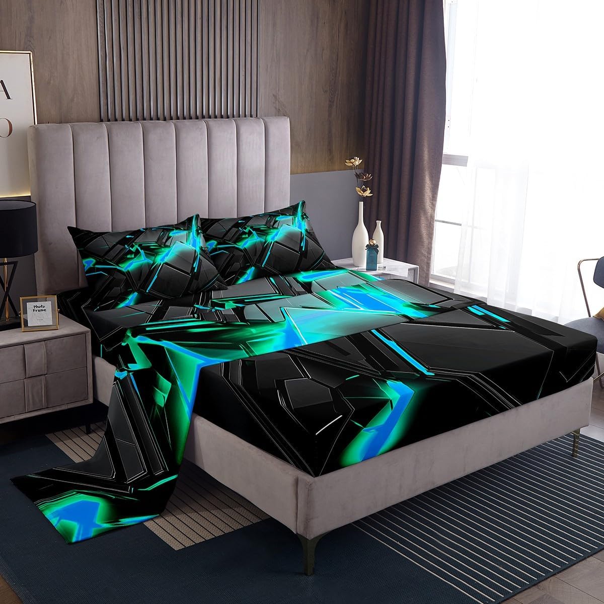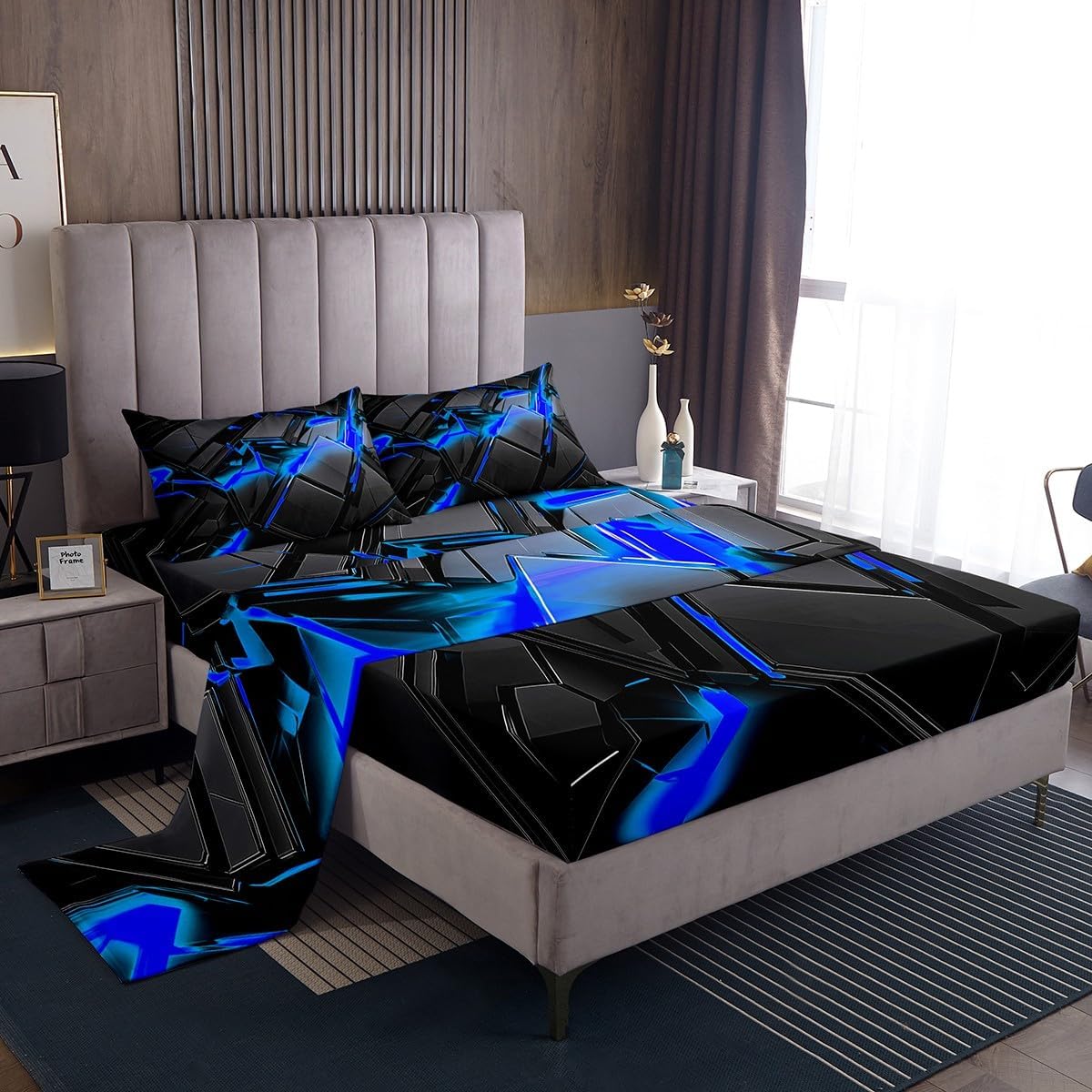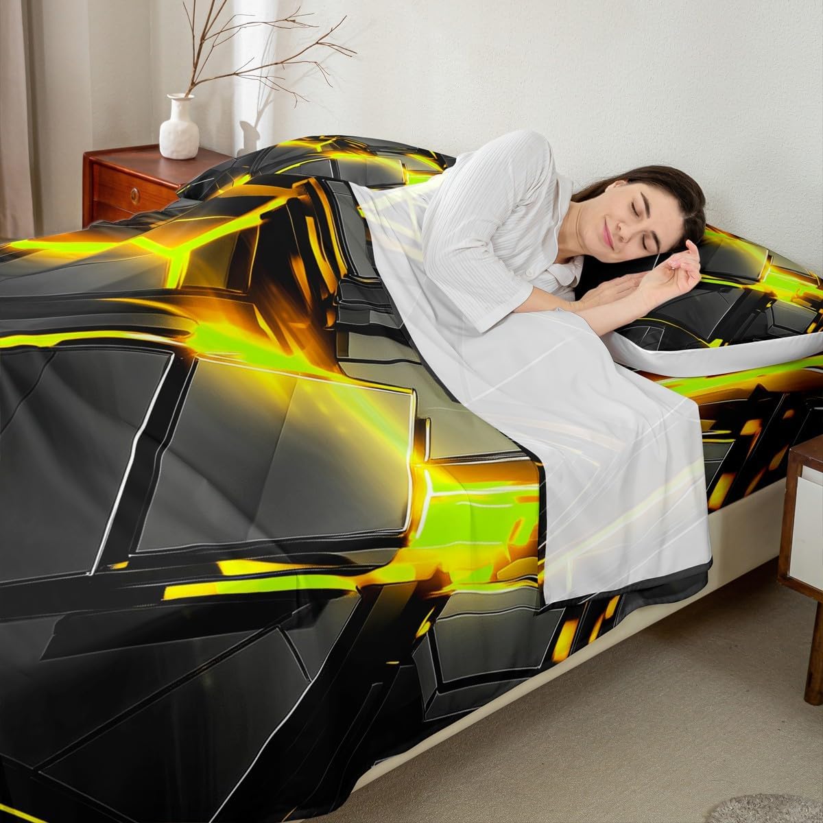 Our bedroom decor bed sheets set look with the vivid stylish and elegant print specifications: Twin Sheet Set: 1 twin fitted Sheet 39 inch x75 inch x16 inch, 1 twin flat sheet 66 inch x96 inch and 1 pillowcase 20 inch x30 inch Full sheet set: 1 full fitted sheet 54 inch x 75 inch x 16 inch, 1 full flat sheet 81 inch x 96 inch and 2 pillowcase 20 inch x 30 inch Queen sheet set: 1 queen fitted sheet 60 inch x 80 inch x 16 inch, 1 queen flat sheet 90 inch x 102 inch and 2 pillowcase 20 inch x 30 inch deep pocket fitted sheet with elastic all around materials: microfiber fabric, lightweight and soft design: With vibrant and novelty designs and 3d print technique, this duvet cover is very suitable as room decor for boys and girls care instructions dry clean preferred; machine washable, use cold water on gentle cycle, tumble dry low