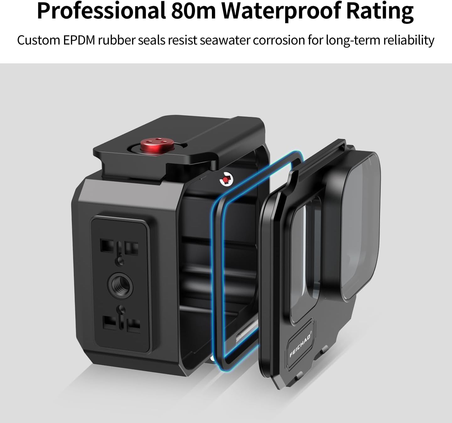 FEICHAO 262ft/80m Underwater Diving Case with 1/4 Thread, Cold Shoe Mount Compatible with Ace Pro/Ace Pro2 Description Material: Aluminum Feature: 1. Aluminum alloy CNC process 2. High-transmittance tempered glass, clear imaging, capable of withstanding 80m deep water pressure 3. 1/4" ARRI-Standard positioning holes, M3 screw holes, cold shoe mounting bracket, quick-release magnetic bases on both the base and sides, compatible with multiple usage scenarios