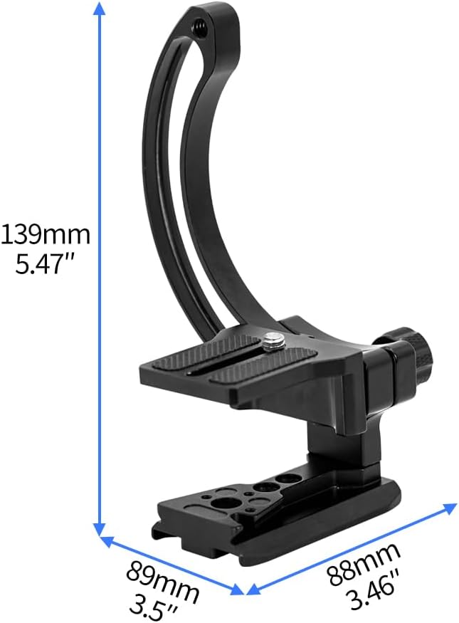 FEICHAO Rotatable Half Collar Bracket 38mm Dovetail Expansion Board Plate for DSLR Camera Lens-Supports Max 90mm Ring Lens Mount ing Description Material: Aluminum alloy Suitable for lenses up to D90mm Functional Use: 1. DSLR camera can quickly switch between horizontal and vertical ing mode and keep the center point of photography unchanged. Adjustable angle range 0-110°, single knob locking positioning, switching sliding is relying on bearings, smooth and non-jamming. 2. The plate with 12mm travel lifting platform, according to the size of the camera to adjust the center point, to ensure that the center remains unchanged, this range is compatible with most of the cameras on the market. 3. No interference at the top, does not affect the normal ing of the camera to extend the adjustment. 4. The bracket supports lenses up to 90mm in diameter. 5. 38mm dovetail plate (Arca-Standard) can be quickly mounted and dismounted in the dovetail clamp, such as tripods, stabilizers and other equipment. 6. The bracket has a 1/4 ARRI-Standard locating hole, which allows it to be mounted on equipment with a 1/4 screw.
