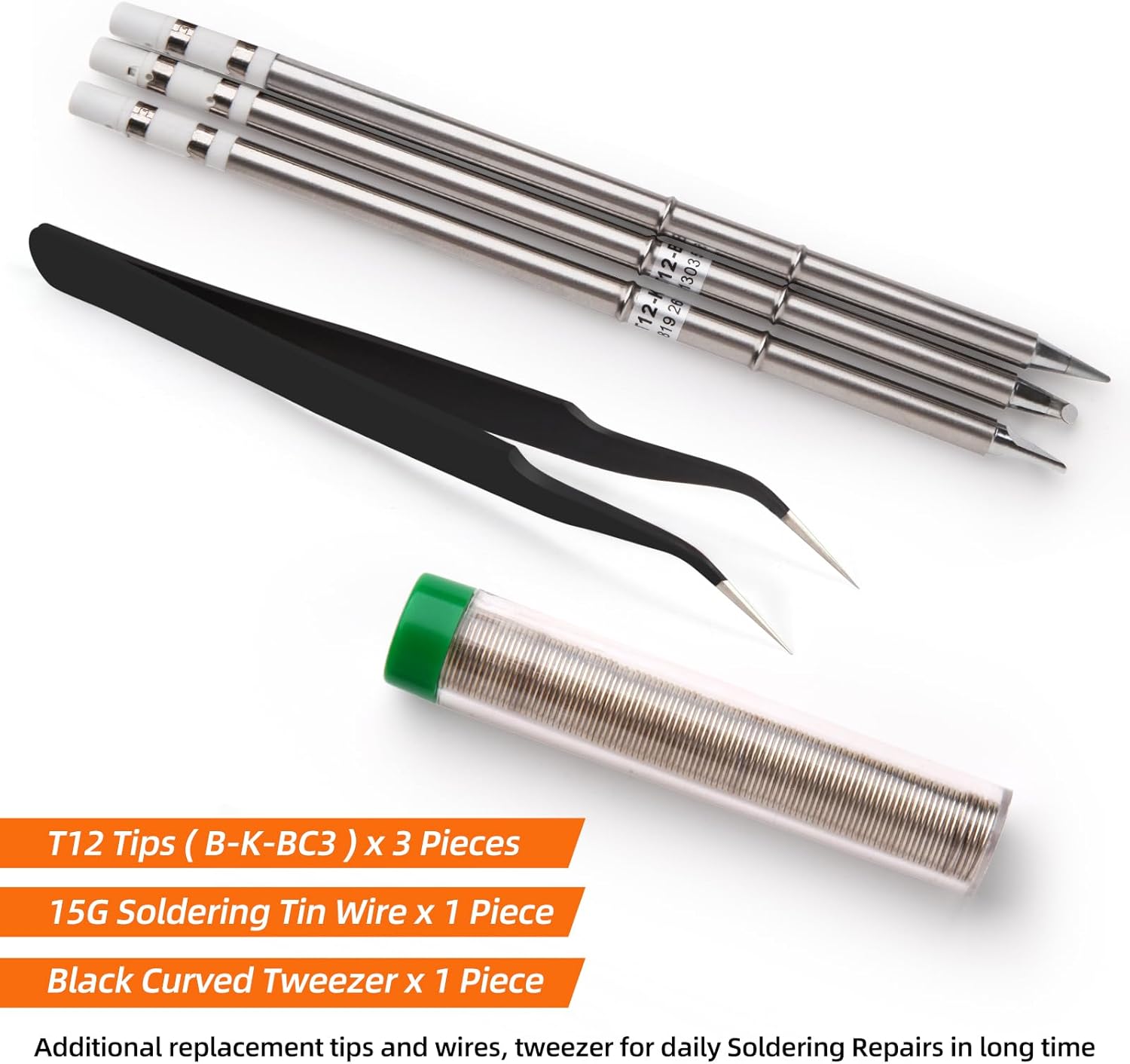 | Included Components | 1pc main unit, 1pc soldering iron holder, 3pcs soldering tips (T12-B/BC3/K), 1pc power cord, 1pc 12g solder wire, 1pc soldering stand, 1pc cleaning tips sponge, 1pc anti-static tweezer, 1pc manual. |