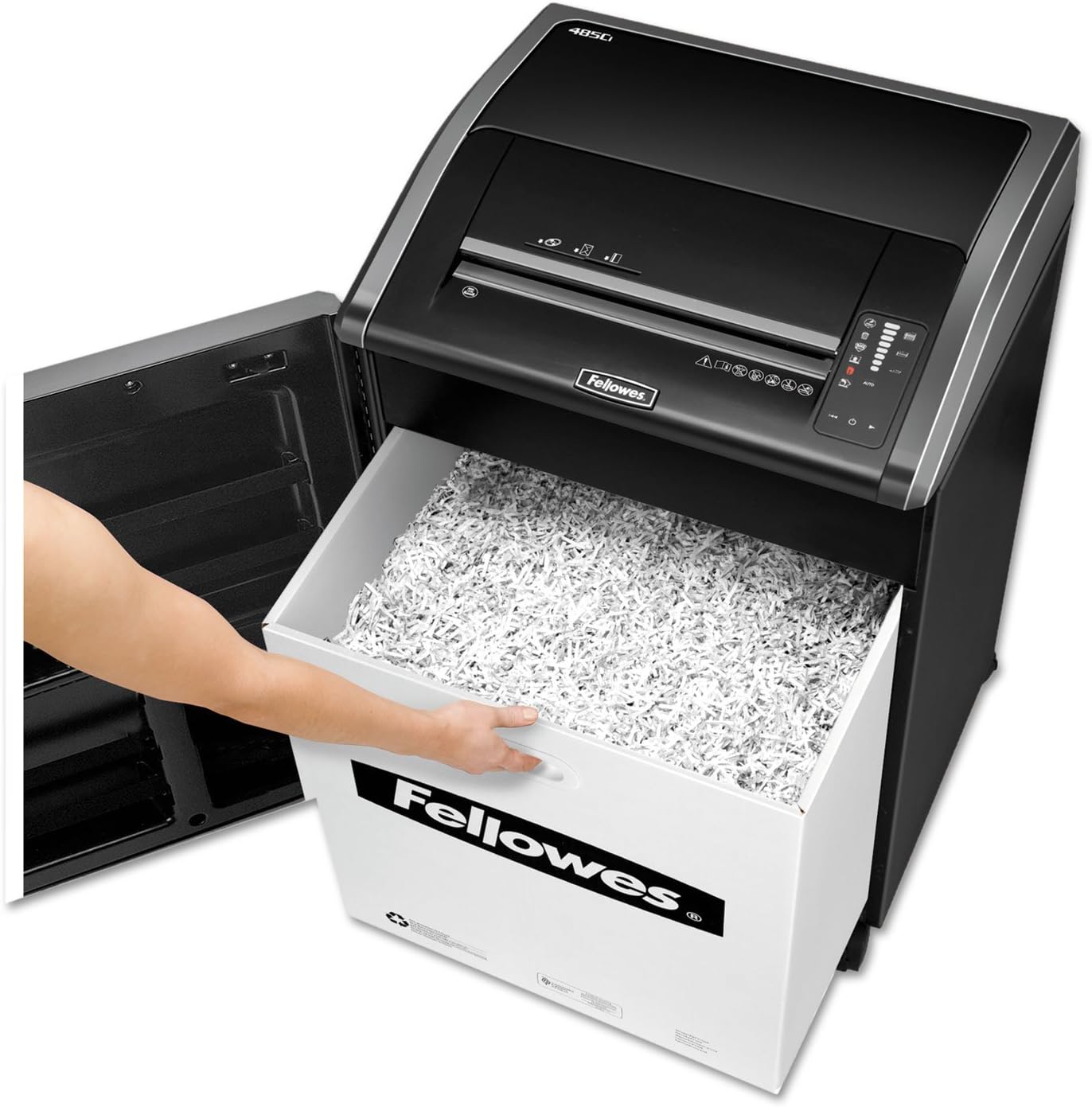 The Fellowes Powershred 485Ci Cross-Cut Commercial Shredder can shred up to 30 sheets of paper per pass into into 503 (5/32" x 1-1/8" Security Level P-4) cross-cut particles. Designed and assembled in the USA this TAA Compliant machine also safely shreds CDs/DVDs, credit cards, staples, paper clips and junk mail. Achieve hassle-free shredding with all of the features the 485Ci has to offer. Get three levels of advanced jam prevention with Fellowes 100% Jam Proof System which eliminates paper jams, powers through tough jobs and maximizes productivity. The machine's Auto-OilTM Technology takes the guesswork out of maintaining your shredder by automatically oiling the cutters at regular intervals. To protect more than your identity, the patented SafeSense Technology is designed with an electronic safety sensor that surrounds the paper entry and automatically disables the shredder when hands touch the paper opening. Also, the 485Ci's Energy Savings System provides optimal energy efficiency 100% of the time-in use and out of use. With the ability to shred continuously, the 485Ci is ideal for departmental use and includes a 35-gallon removable basket. Backed by a worry-free 2-year product and service warranty plus lifetime cutter warranty. 37.5" H x 25.00" W x 20.00" D