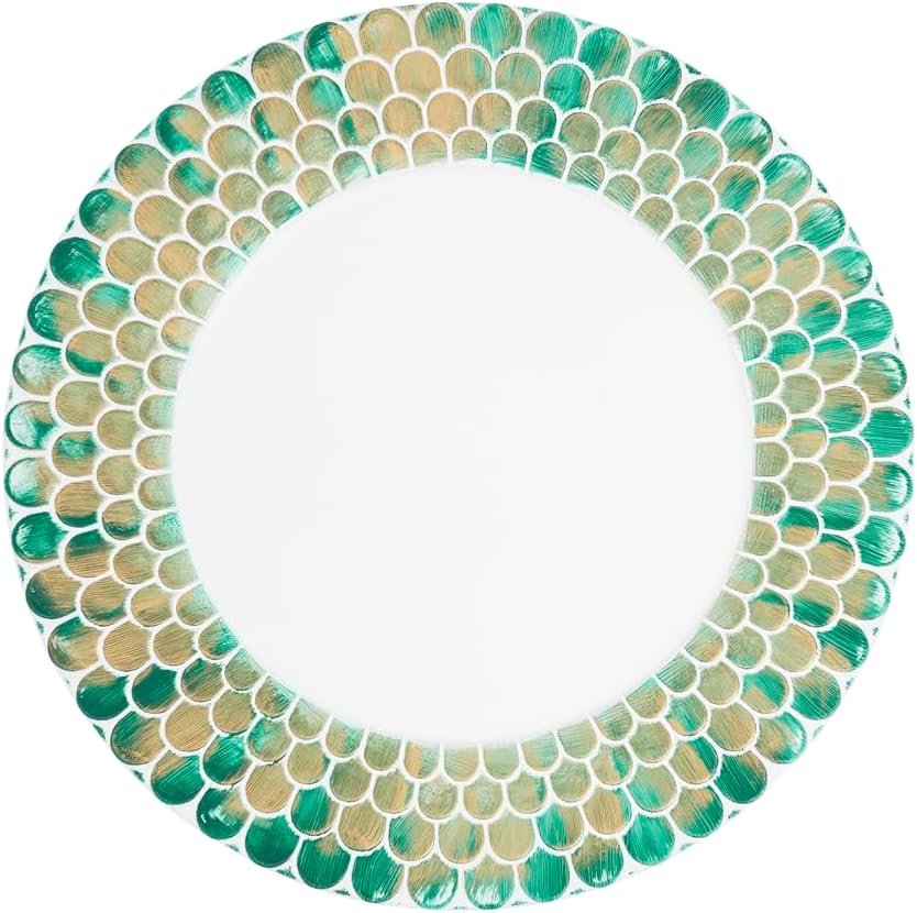 Bring the essence of coastal elegance to your dining experience with this Set of 4 Sea Green Scales Border Plastic Charger Plates. These round chargers feature a vibrant and artistic scale pattern in green and natural hues, inspired by the iridescent shimmer of ocean life. Perfect for entertaining or adding a special touch to everyday meals, these chargers are a versatile addition to any tablescape.