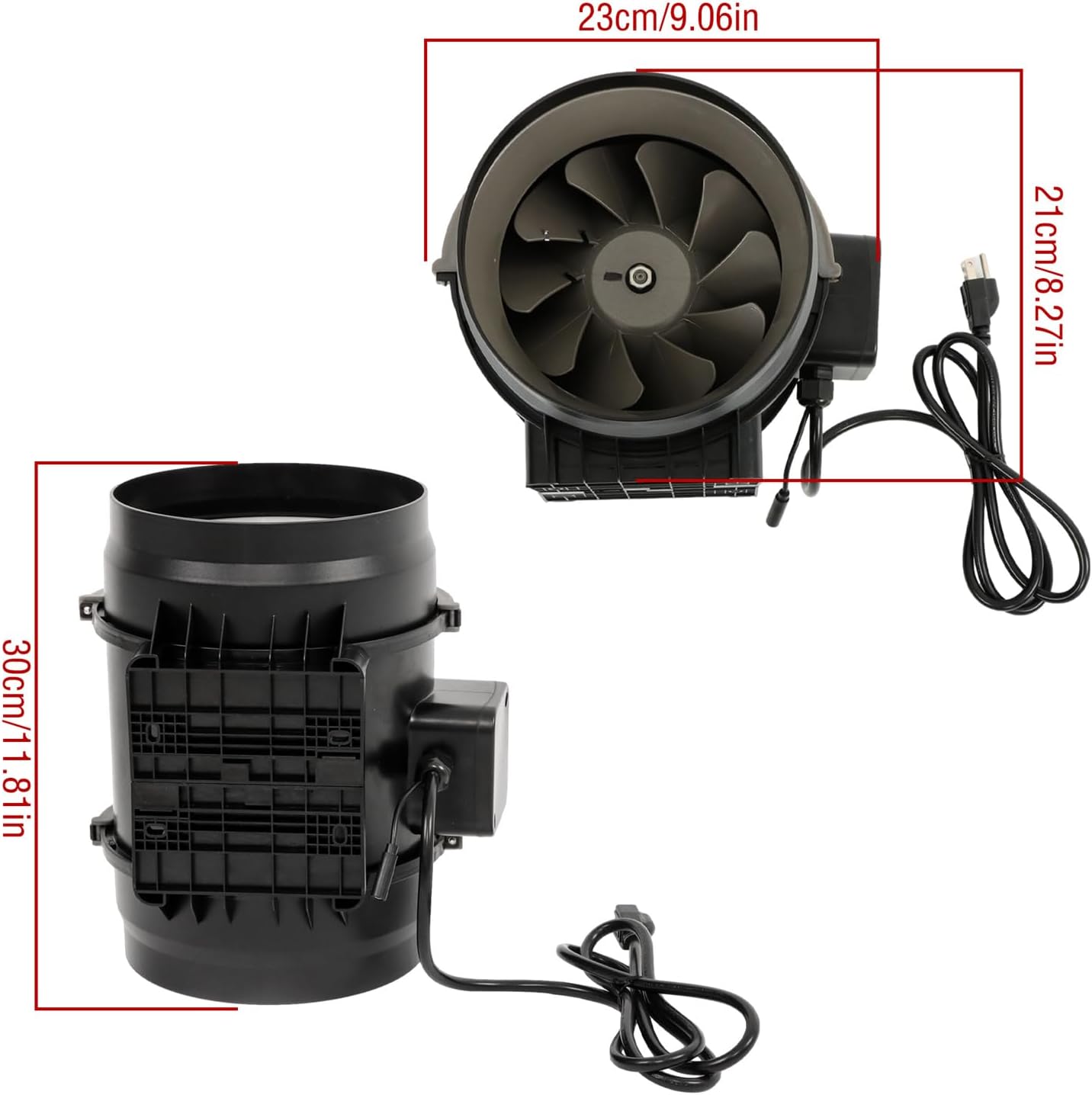 8 Inch Inline Duct Fan Plastic ABS Black 807CFM Temperature and Humidity Controller EC Motor for Heating Cooling, Grow Tents, Hydroponics and Cooling BoosterSpecification: Material: Plastic ABSAirflow: 807CFMNoise Level: Less than 50dBFeatures:The built-in duct fan is designed for efficient ventilation, specifically for scenarios such as heat dissipation, dehumidification, and smoke extraction. Whether it's the constant humidity requirements of an air-conditioned tent, the heat dissipation challenges of an electronics equipment room, or the rapid removal of kitchen grease fumes, it can quickly replace the air with a powerful airflow of 807 CFM, ensuring a dry and fresh environment. The controller allows for seamless switching between on/off, timer, or automatic modes (supporting high/low temperature and high/low humidity triggers). In case of environmental abnormalities, the fan automatically starts/stops and triggers an alarm, eliminating the need for manual monitoring.Crafted from premium materials and accuracy engineering, it ensures long-term stable operation. Good for greenhouses, basements, commercial kitchens, server rooms, and more, it is a reliable choice for improving air quality.