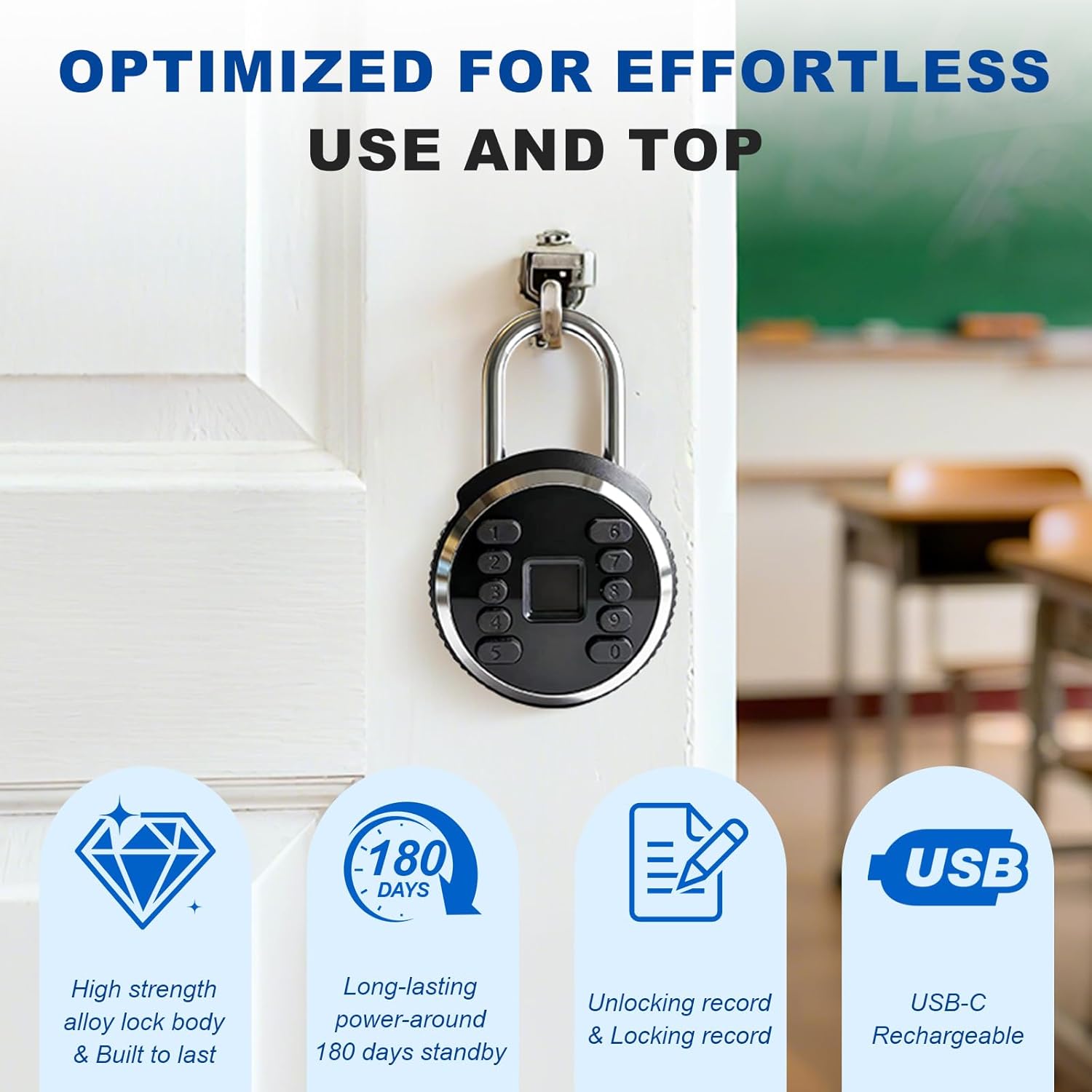 Looking for a convenient alternative to traditional keys or combination locks? This smart fingerprint padlock is designed to offer secure, everyday access with multiple unlocking options. The lock supports fingerprint, passcode, and Bluetooth app unlocking, allowing users to choose between fully offline operation or app-based management. In Local Mode, fingerprints and passcodes can be managed directly on the lock without installing any app. In Bluetooth Mode, users can unlock via smartphone and view unlock records within Bluetooth range. An advanced semiconductor fingerprint sensor enables fast recognition under typical usage conditions, while support for up to 20 fingerprints makes it suitable for shared environments. The IP67 water-resistant design (when the charging port cover is securely closed) helps protect the lock during daily indoor and outdoor use. Built with a zinc alloy body and stainless-steel shackle, this biometric locker lock is suitable for gym lockers, school lockers, employee lockers, cabinets, bicycles, gates, and other personal storage applications. The USB-C rechargeable battery provides long-lasting performance with minimal charging needs.