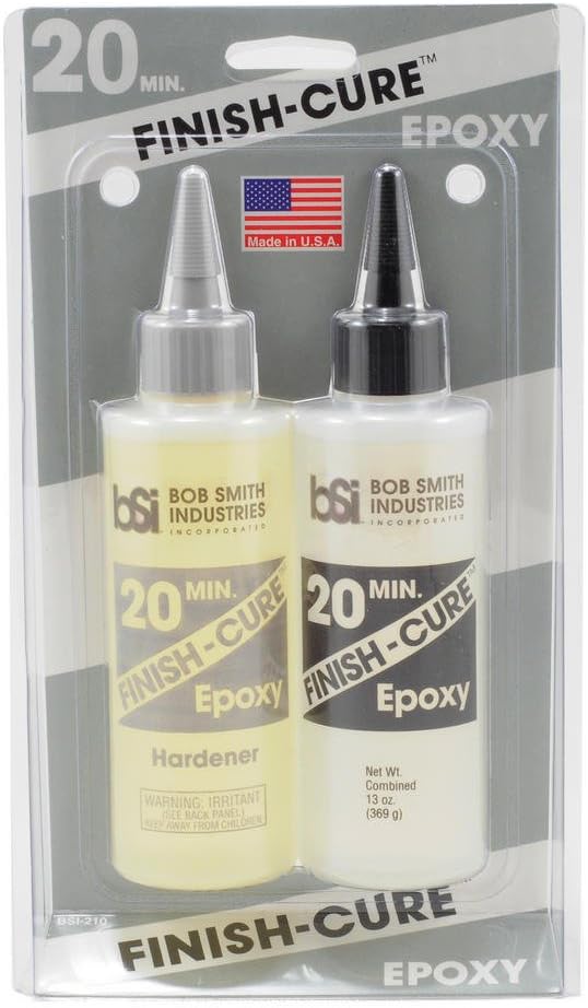 FINISH-CURE 20 min. epoxy is an excellent, low odor substitute for polyester resins. It can be used for applying fiberglass cloth to wood or by itself to give wood a surface ready for primer and paint. FINISH-CURE can be sanded the easiest of all our epoxies and is excellent for the sheeting of foam core wings. Allow 8 hours for full curing. For best results, FINISH-CURE should be heated to a temperature above 85 degrees F or applying light weight fiberglass, lay cloth on balsa first, then brush on FINISH-CURE. When fully saturated, go over the surface with a heat gun, and then squeegee off excess epoxy with a playing card from an old deck. Heat and remove excess several times for a light weight finish. If room temperature is below 70 degrees F use a heat gun on the surface several times for the next 2 hours. When dry, lightly sand, then fill surface with a low weight spakeling compound, scrapping off excess with a playing card. Sand to a smooth finish ready for primer. For heavy weight fiberglass, apply the epoxy before and after laying down the cloth. FINISH-CURE is best mixed in a disposable cup.