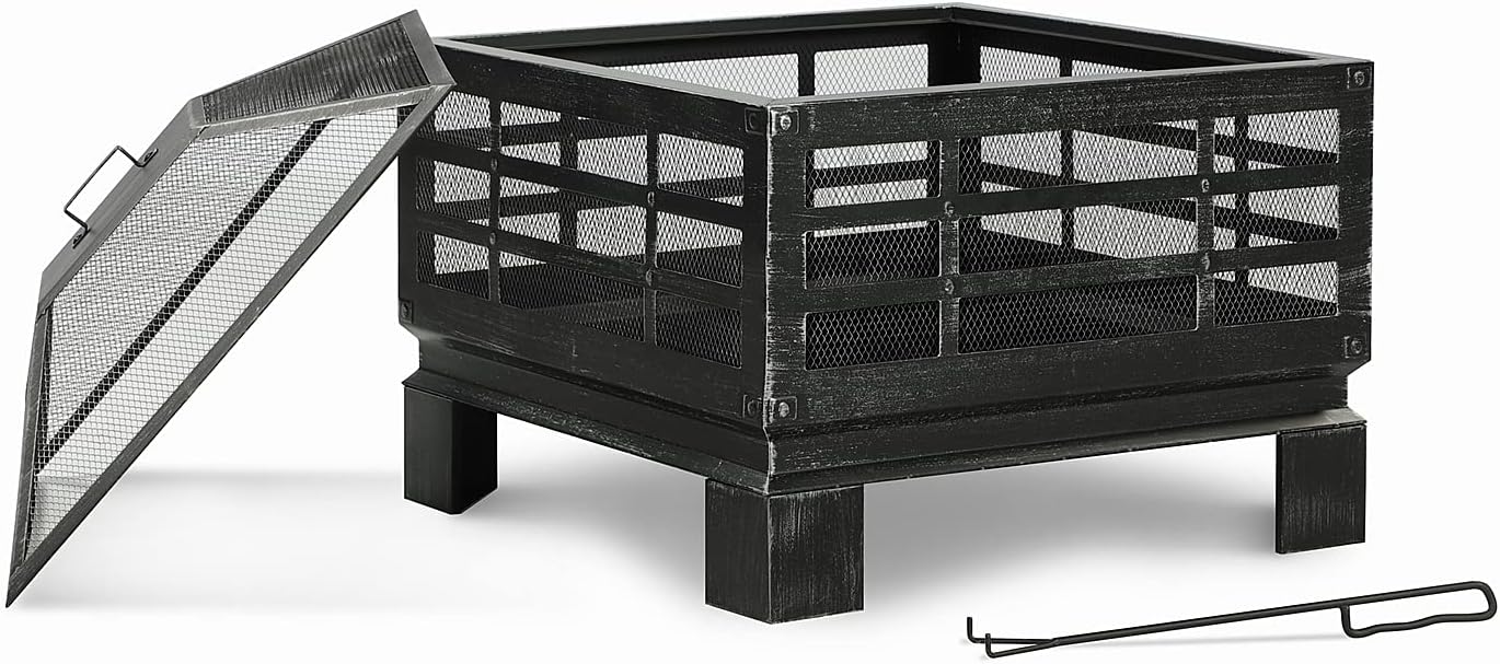 This fire pit has a weathered black finish with exposed silver hardware that brings an industrial look to your patio. Its frame is made from steel with a weather- and rust-resistant design, and it's built on elevated square legs for lots of visual interest. This fire place features a clean-lined, square design that gives you a 360-degree view. A mesh spark screen with a handle on the top prevents stray embers from flying out. It also includes a poker to easily turn logs over and stir up your fire. This fire pit should not be placed on a wooden deck.Specifications:Product Type: Fire pitColor: BlackMaterial: SteelFinish: Black/Brushed SilverProduct Shape: SquareSize: 26 x 26 x 24 inch (LxWxH)Weight:23.15lbSize(Pack):29 x 29 x 15 inchWeight(Pack):30lbProduct Care: Wipe clean with a soft cloth once cooledLocation: Outdoor Use OnlyFuel Type: Wood BurningPackage Include: Fire Pit * 1 Mesh Spark Screen * 1 Fireplace Poker * 1 Cover * 1 Attention:-Keep kids and pets away from the fire pit and don’t touch the hot fire bowl with your hands !!!-It is a normal phenomenon that the paint of the fire pit peels off after the fire pit is used several times.-In order to prolong the service life of the fire pit, please don't put ice or water into the fire bowl. This will lead to the rust of the fire bowl after a long time.