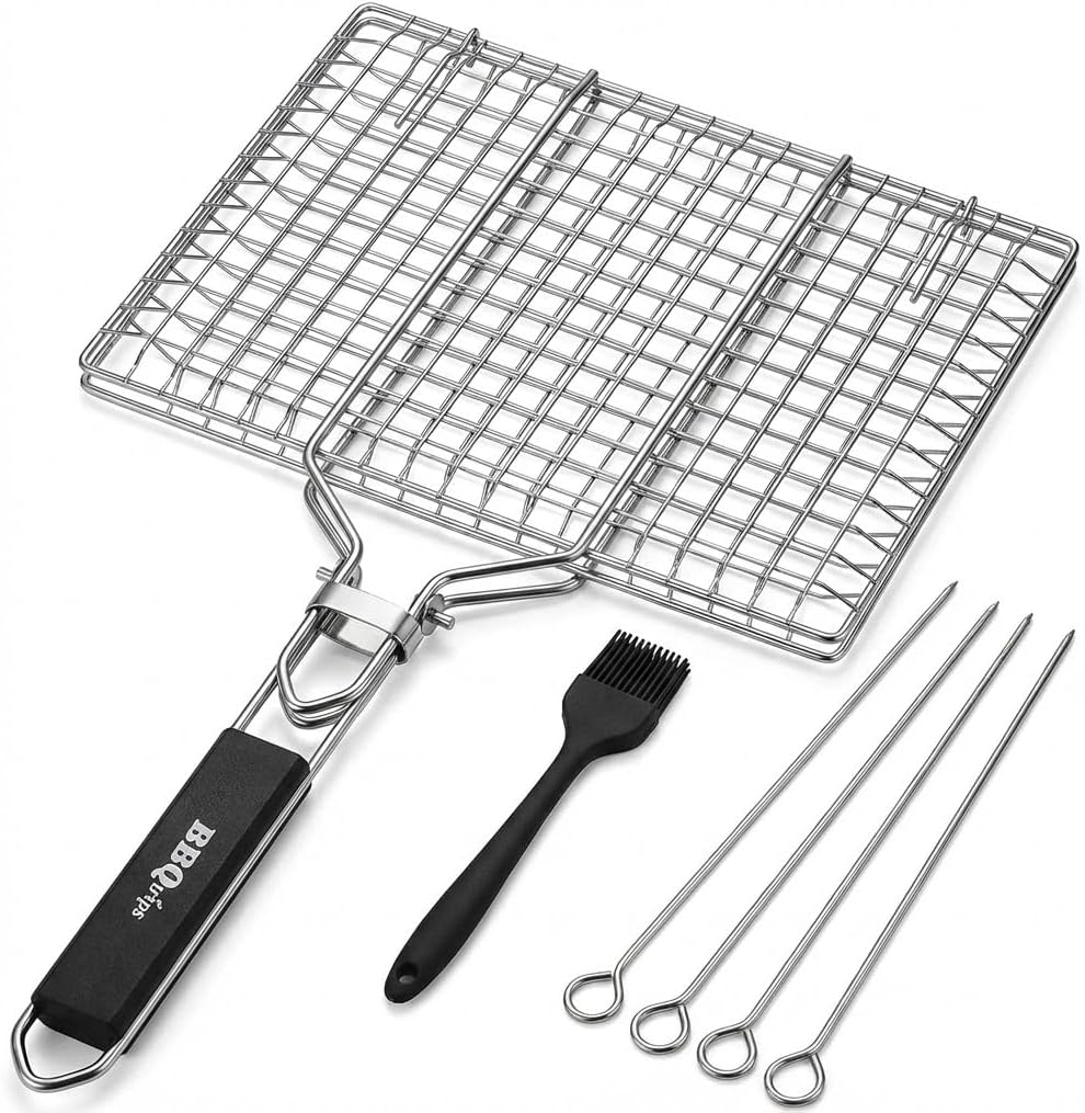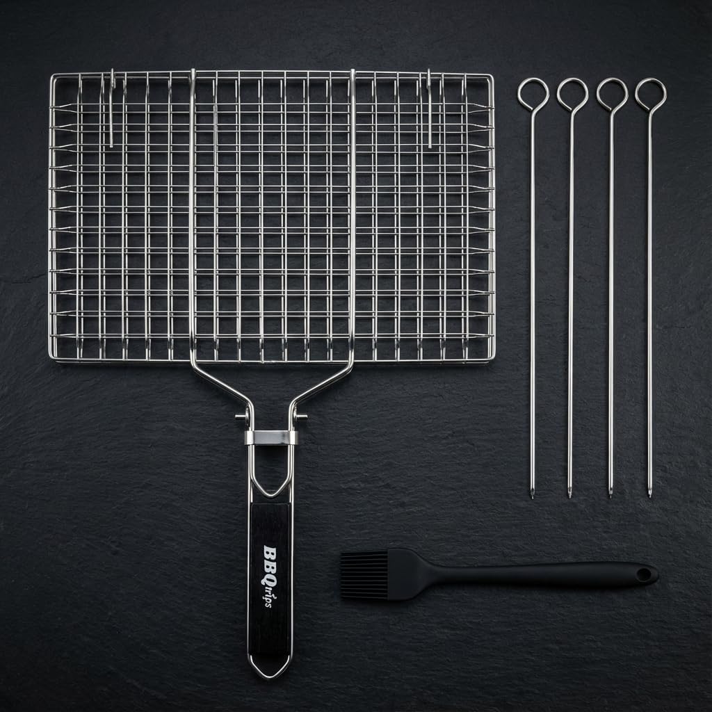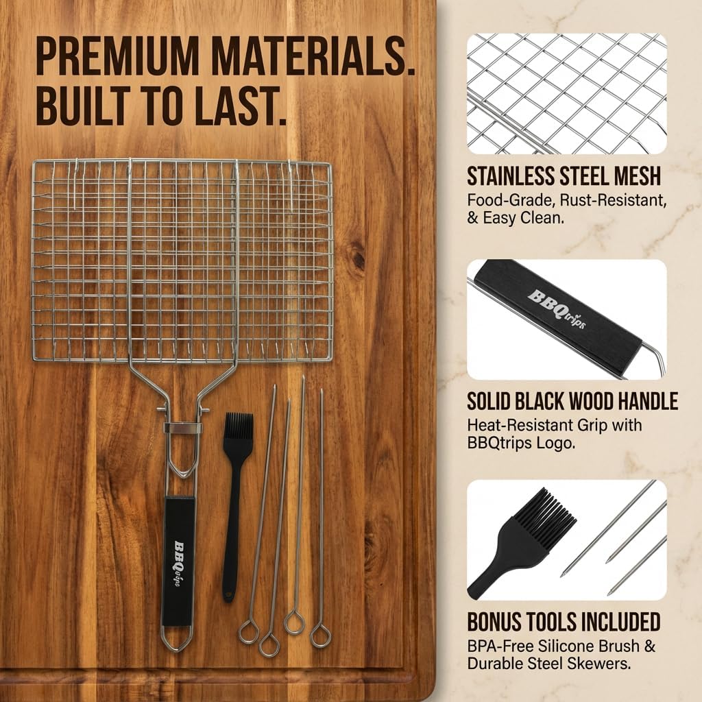 Grilling Delicate Foods Shouldn't Be a Struggle.We all love the smoky flavor of charcoal-grilled food, but we hate the mess—fish fillets falling apart, asparagus slipping through the grate, or burning our hands on hot metal handles.The BBQtrips Grill Basket solves these problems with a practical, user-friendly design.Why This Design Makes Sense:Lock It & Flip It: The latch mechanism holds food securely, allowing you to flip the basket without holding your breath. It is optimized for thinner foods (like bacon, fish, and sliced veggies) that usually slide off standard grills.Wooden Handle = No Burns: We use a wooden handle because it stays cool naturally. You can turn your food comfortably without needing bulky heat-proof gloves.Detachable for Cleaning: This is our favorite feature. Wood shouldn't go in the dishwasher, but stainless steel should. That’s why we made the handle removable.Important Care Instructions: To extend the life of the product, we recommend hand washing. However, if you want to use a dishwasher, you MUST remove the wooden handle first. 1. Slide the lock to detach the handle. 2. Place the stainless steel basket in the dishwasher. 3. Wipe the wooden handle clean with a damp cloth.Package Includes: 1 x Stainless Steel Grill Basket 1 x Detachable Wooden Handle 1 x Silicone Basting Brush 4 x Stainless Steel Skewers