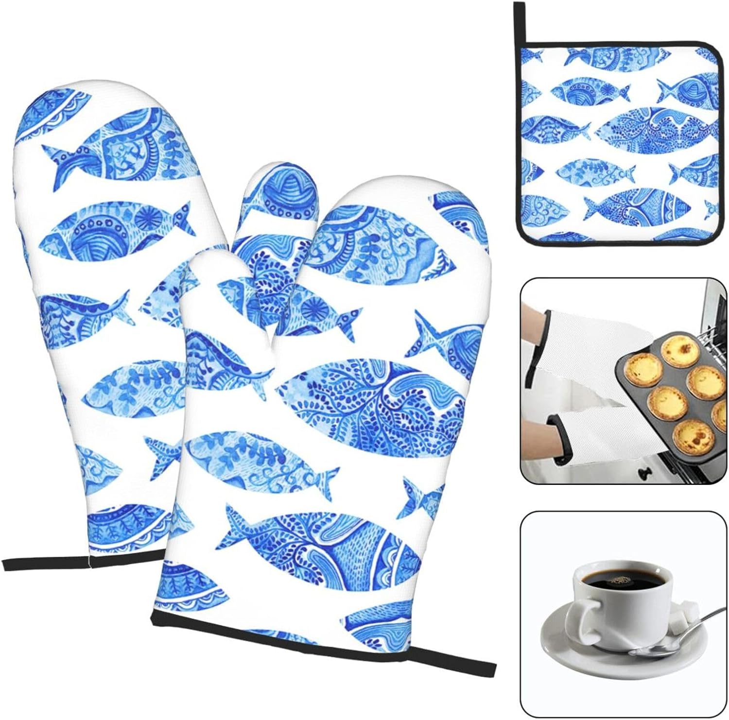 upgrade your kitchen safety with this fish painting print microwave gloves, oven mitts and pot holders sets. crafted from water repellency polyester and heat-resistant fabric, these kitchen baking three piece set offers reliable protection for hands while handling hot items. the double-layer waterproof design ensures easy cleaning after use. suitable for various cooking scenarios including microwave ovens, conventional ovens, stovetop cooking, and outdoor grilling. the side hanging rope allows convenient storage when not in use. the thick construction provides excellent heat insulation without compromising dexterity. this unisex kitchen essential combines functionality with practical design for everyday cooking needs. the heat-resistant gloves maintain comfort while offering superior protection against burns. an essential addition to any modern kitchen setup