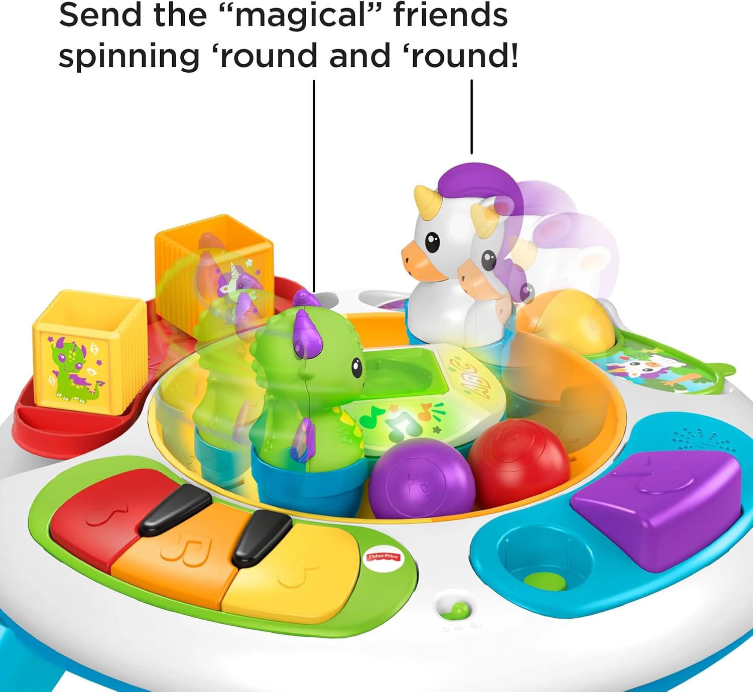 The Fisher-Price Enchanted Friends Learning Table is loaded with exciting activities for your baby to stack, spin, flip, and press all play time long! Stack up the blocks or press the piano keys to get the colorful lights and learning songs going, then press the purple button to send the balls spinning 'round and 'round! Your little explorer can even move their unicorn and dragon friends around the table or place them in the blue cups to send them on an 'enchanted' spinning ride. Plus, as your baby grows, you can easily attach the table legs so your toddler can stand up and cruise around from one activity to the next! Where development comes into play Fine Motor: Exciting, hands-on activities like button-pushing, spinning, and ball play help strengthen your baby's hand-eye coordination. Gross Motor: Your toddler can flex those gross motor skills as they stand up and cruise around the table to interact with the toys. Sensory: Colorful lights, playful music and sounds, and different textures engage your baby's developing visual, auditory, and tactile senses.