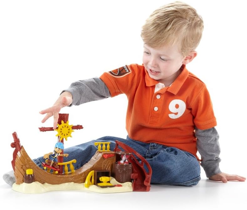 Product Description Jake loves to get caught up in the action all over Never Land, and what better place is there for fun than at Shipwreck Skate Beach located on Hide Out Island. Take Jake for a run on the shipwreck half-pipe by attaching him onto the clear swing arm. With a spin of the ship's wheel, Jake rides the half-pipe back and forth. Spin the wheel all the way around and Jake catches air skating a cool half-pipe 360! Lift the lever to catch Jake in a mid-air stall at the edge of the half pipe. But watch out for Tick Tock as you press down on the front barrel and that hungry croc breaks through looking for a pirate snack! Send Jake skating down the ramp, triggering a sneaky Captain Hook who's lurking about to see what all the excitement's about. Just remember – when you're looking for treasure, “X” marks the spot. Drive Jake over the “X” button to reveal a hidden trophy and treasure! 3+ From the Manufacturer Jake loves to get caught up in the action all over Never Land and what better place is there for fun than at Shipwreck Skate Beach located on Hide Out Island. Take Jake for a run on the shipwreck half-pipe by attaching him onto the clear swing arm. With a spin of the ship's wheel, Jake rides the half-pipe back and forth. Spin the wheel all the way around and Jake catches air skating a cool half-pipe 360. Lift the lever to catch Jake in a mid-air stall at the edge of the half pipe. But watch out for Tick Tock as you press down on the front barrel and that hungry croc breaks through looking for a pirate snack. Send Jake skating down the ramp, triggering a sneaky Captain Hook who's lurking about to see what all the excitement's about. Just remember - when you're looking for treasure, "X" marks the spot. 3+.