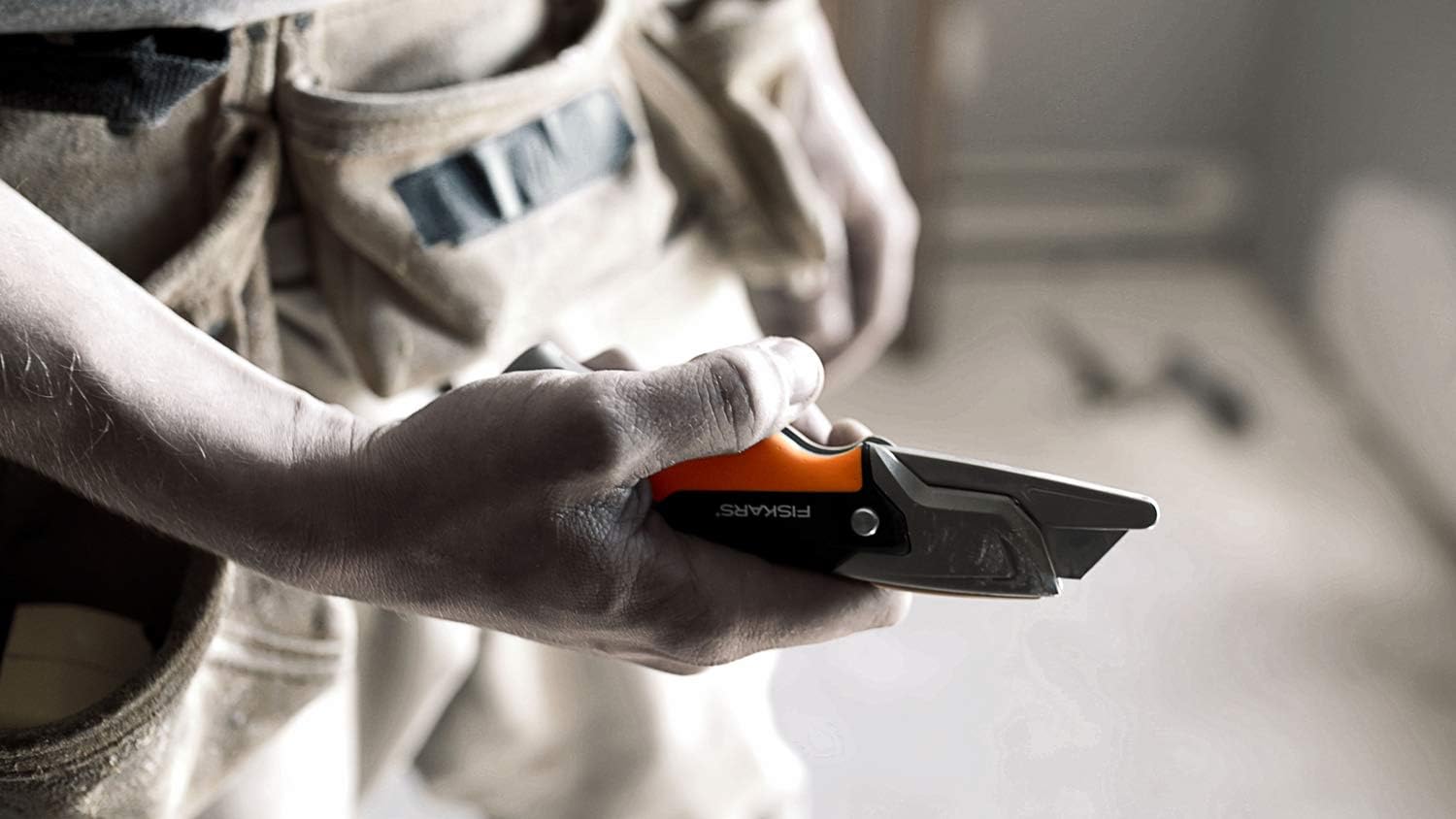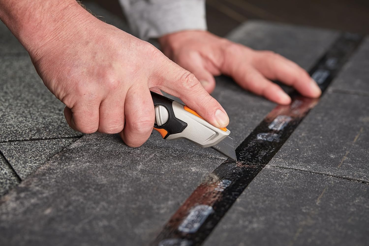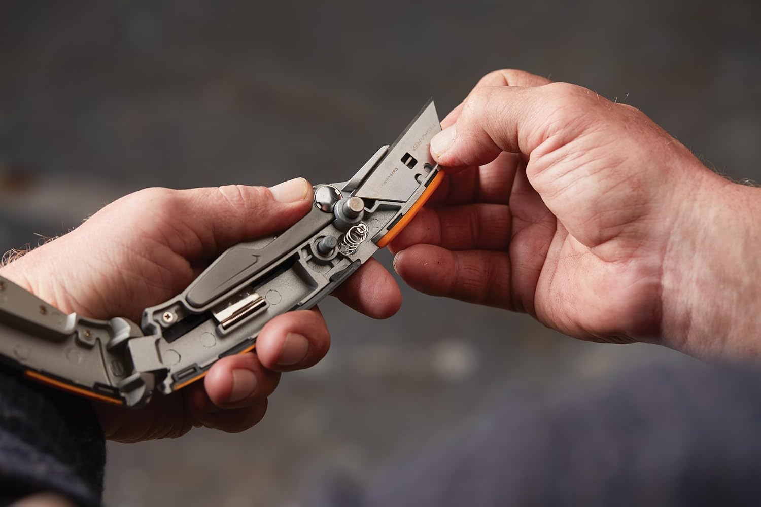 Features a unique folding blade guard for effective and convenient blade security, Deploys quickly with one-hand for easy use or safe storage - Metal body for optimal balance and durability and a reinforced metal end that provides reliable resistance against impact and drops - CarbonMax blades feature specially engineered coating that keeps blades sharper 24x longer - Built-in storage for 5 blades, Highly durable, Easy to clean, Finnish design - Contents: 1x Fiskars CarbonMax Fixed utility knife including a replacement blade, Length: 18.2cm, Weight: 203g, Material: Stainless steel blade/plastic handle, Colour: Black/Orange, 1027222