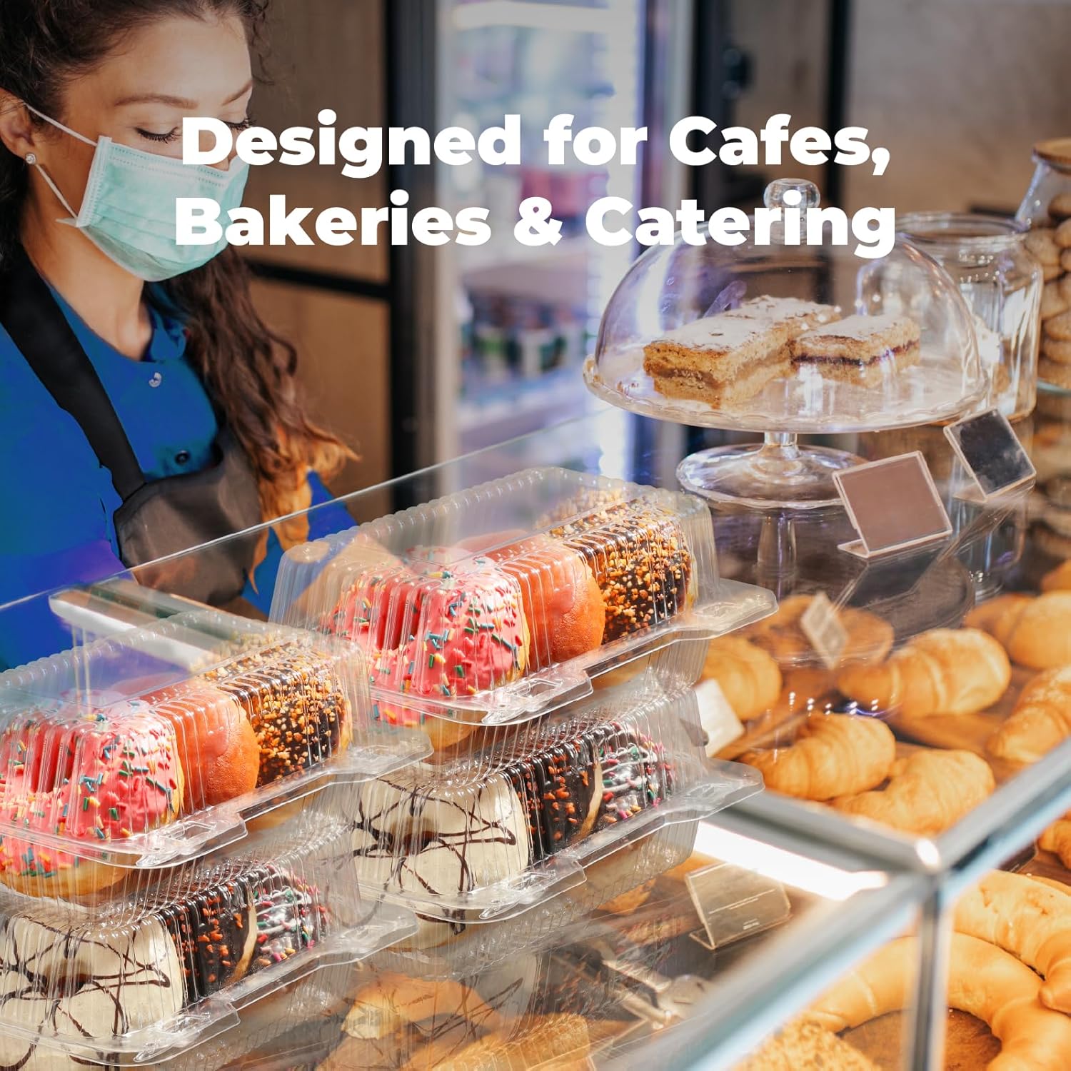 Clear Plastic Hinged Containers for FoodLet your customers, guests, or family members be delighted with your beautifully-created baked goodies, pastas, salads, sandwiches, and desserts in these durable crystal clear containers for food. Aside from clearly showcasing the delectable food inside, these clamshell take out containers keep food secure and fresh.Product Features:300 pieces value pack plastic disposable food containers with hinged lids9" x 5.5" x 3.6" dimensionCrystal clear design for optimal visibilityHinged lid to lock in flavor and freshnessStrong buckle to keep food secureEasy to open and easy to close tabsMade of high quality and safe materialReinforced sidewalls design offers durability and sturdinessApplications:To Go Containers for Pastas, Salads, and PastriesClear Small Containers for Cake, Pie, and Roll SlicesBoxes for Strawberries, Chocolates, and Cookies