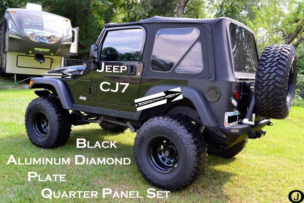 Our corner kit is great for covering rust or dents or just adding some style to your ride. Corners also have NO CUT OUTS in them, which make it nice for those wanting to customize the rear of their jeeps. Panels are all aluminum so they are easy to cut with a jigsaw with a bi-metal blade like 18 or 20tpi. PLEASE NOTE: THESE QUARTER PANEL PARTS ARE SHIPPED FLAT (to save you greatly in shipping) simply start at the tailgate and bend and work your way around the corner, once you have it bent for a nice fit just tuck it under the fender flare "its very easy to do" and then you can attach them. TO INSTALL YOU CAN USE SELF TAPPING SCREWS, OR RIVETS. All of our black items ARE coated with the #1 selling brand Heerculiner bedliner it’s the only polyurethane and rubber granule bed liner there is. We start with the best diamond plate there is "3003 grade highly polished" then it's prepped to accept the rubberized coating. We apply by roller 1 thick layer then let it dry for 48 hrs before we wrap them for sale.