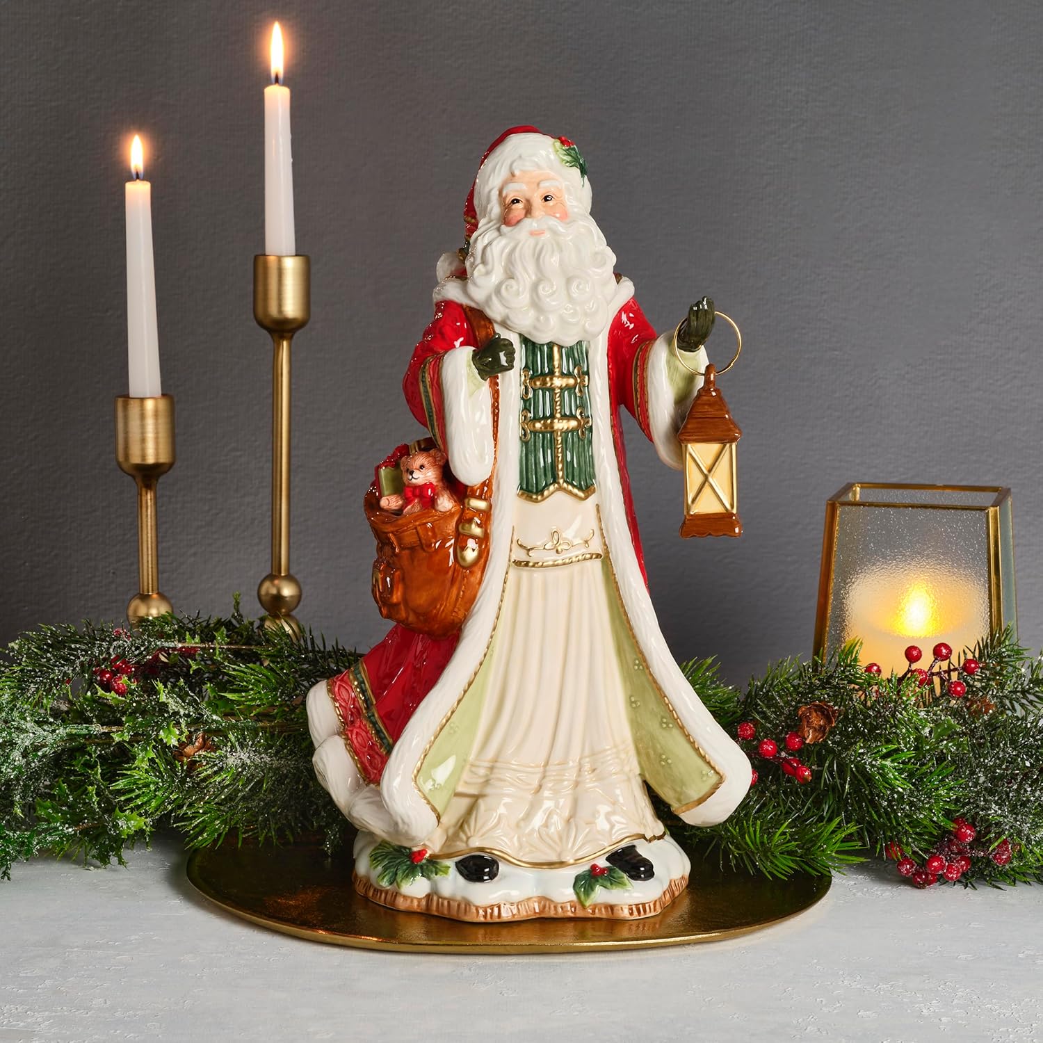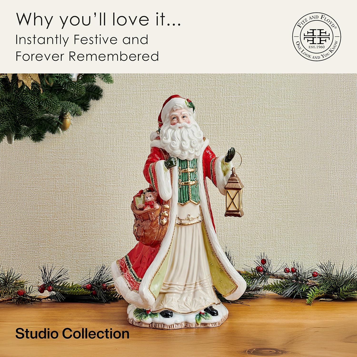 This Fitz and Floyd Studio Collection Crimson Santa Figurine showcases a vibrant red coat with green and white trim, accented by a green buttoned vest with luxurious touches of gold, while carrying a lantern in one hand and a satchel full of toys to bring joy to boys and girls everywhere. Crafted of earthenware and beautifully hand-painted, this Christmas figurine is perfect for placing on mantels, tabletops, entryways, or as a standout centerpiece in holiday displays. This Santa figurine adds warmth and festive charm to any room and also makes the perfect gift. Measures 13-1/2 inches high by 7-1/2 inches in diameter. To clean, simply dust gently with a soft cloth.