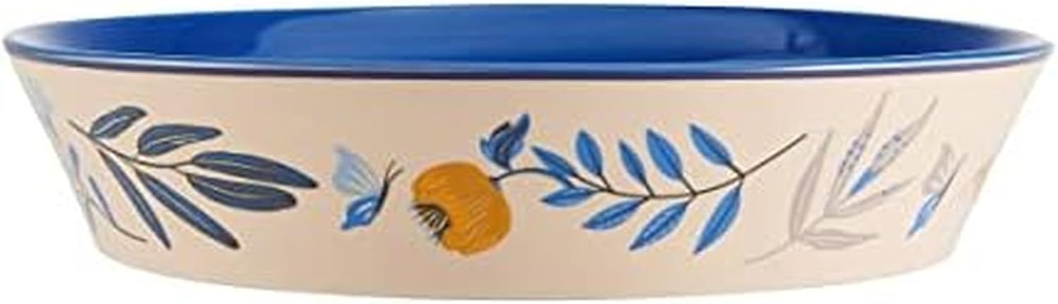 This Madeline 15-Inch Platter by Fitz and Floyd brings the charm of a spring garden to any occasion in vivid shades of gold and blue. Made of durable stoneware with a charming floral pattern and whimsical designs, this lovely serving piece is perfect for serving main courses, appetizers, bread, and more. Measures 15-inches long by 10-1/2 inches wide by 1-5/8 inches high. Dishwasher, Microwave and Oven Safe up to 450 degrees Fahrenheit.