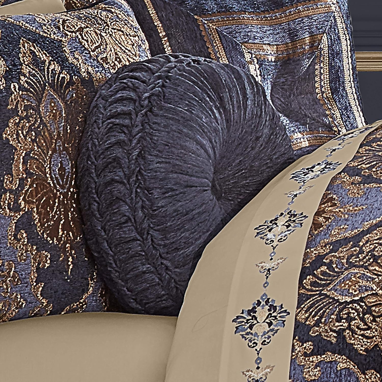 The Tufted Round Pillow uses a beautiful indigo chenille fabric to create a one of a kind accent to this bedding ensemble. This 15" unique pillow is sewn by hand and is finished with a fabric covered button on both sides. Pair it with the bedding set by Five Queens Court for a complete look.