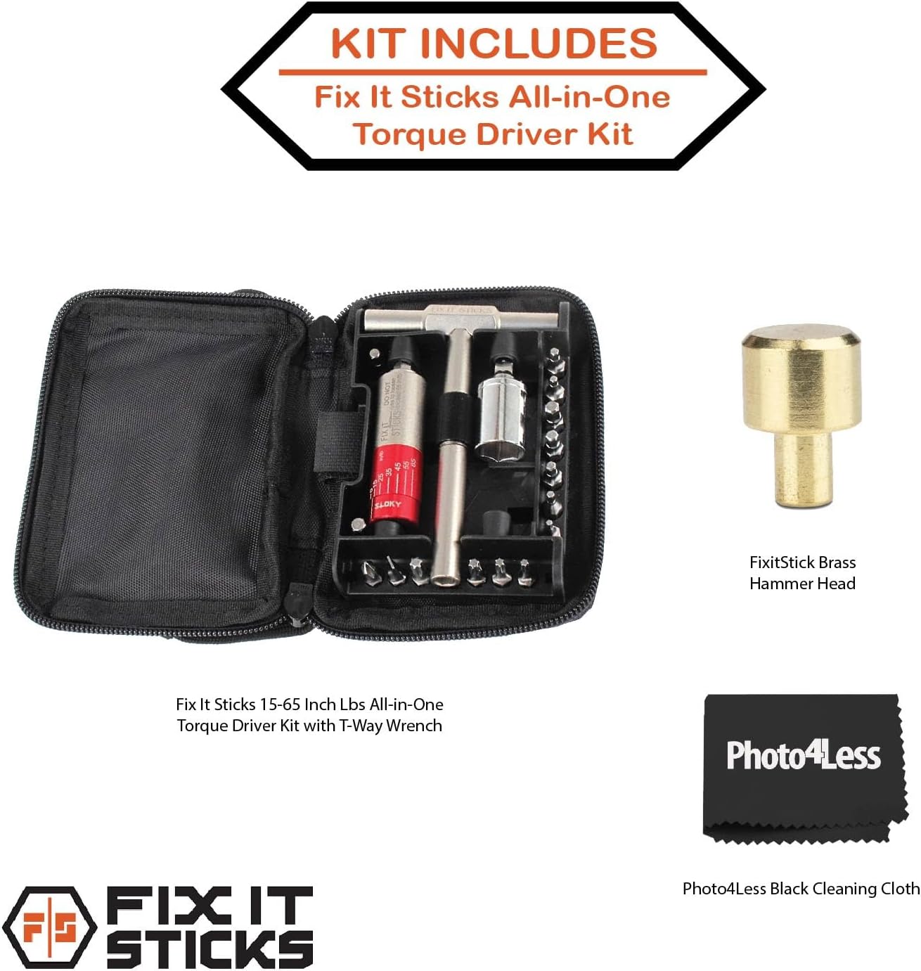 FIX IT STICKS TOOLKIT WITH ALL-IN-ONE TORQUE DRIVERCarry Fix It Sticks' Toolkit with All-in-One Torque Driver and you can tighten down scope rings, mounts, action screws, and more, whether you're in the field, at the range, or at home. Using either the All-in-One Torque Driver you'll never over or under tighten critical components again. Simply turn the drive handle until the hash mark lines up with the torque value you need (from 15 - 65 in-lbs) and you're ready to get to work. Its lightweight and compact, making it ideal for competition, hunting and more.Toolkit includes: All-in-One Torque Driver (15-65 in-lbs) T-Way T-Handle Wrench 15 different bits: T10, T15, T20, T25, [Hex 3/32", 5/64", 1/8", 5/32", 3/16", 2.5mm, 3mm, 4mm, 5mm], P1, Slotted 5mm 1/2" socket and 1/4" bit adapter set Zippered case with molded accessory holderBundle Includes Fix It Sticks Tightening +/- 10% Accurate 15-65 inch-lbs All-In-One Torque Driver Tool Kit w/T-Way Wrench Bits Socket AdaptersFIX IT STICKS Brass Hammer Head Steel Insert BitPhoto4Less Cleaning Cloth