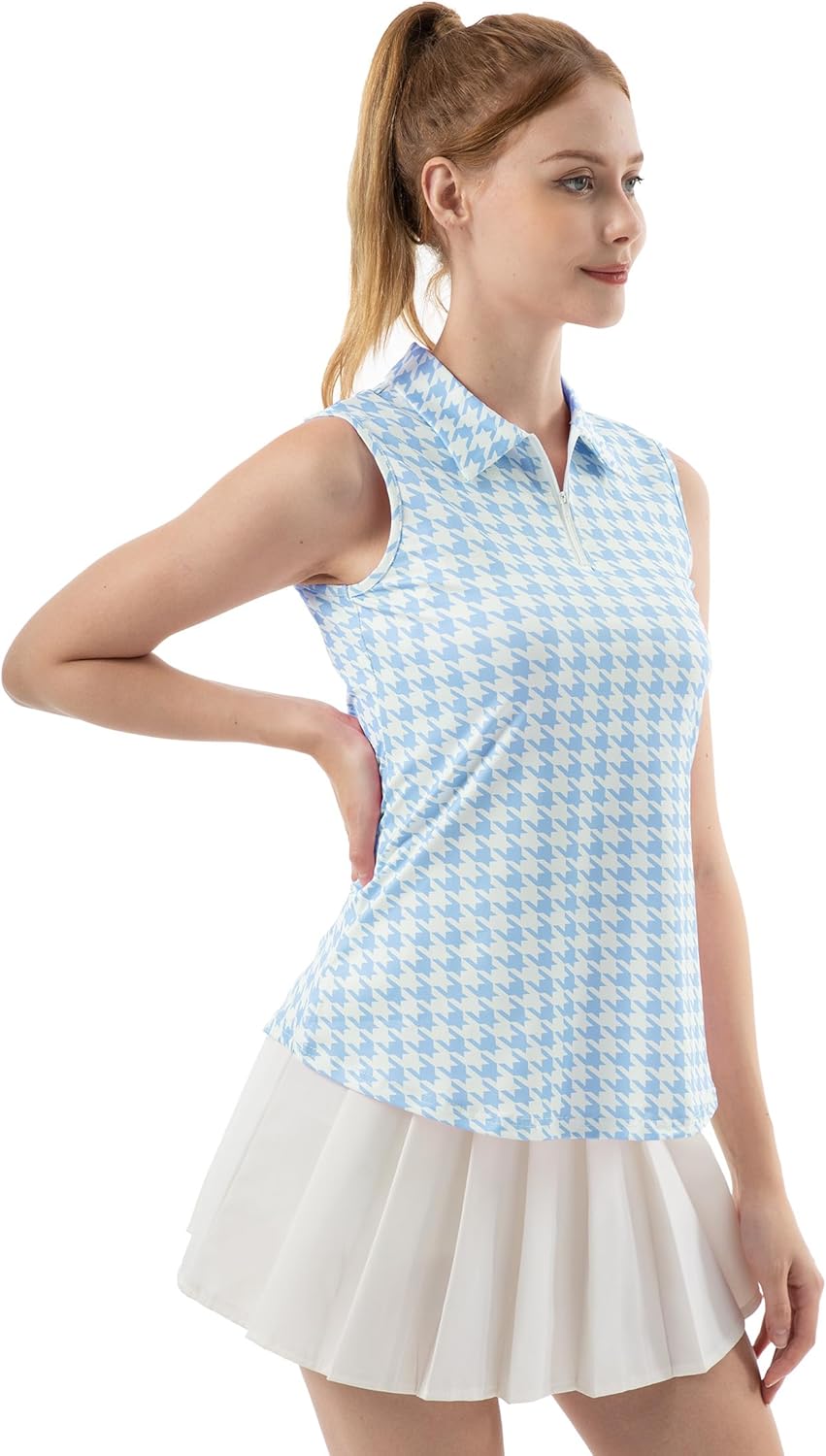 FKEEP Women's Sleeveless Polo Golf Tennis Shirt Tank Tops T-Shirts V-Neck with Collar Quick Dry Workout Athletic (Pink Checkered, M)