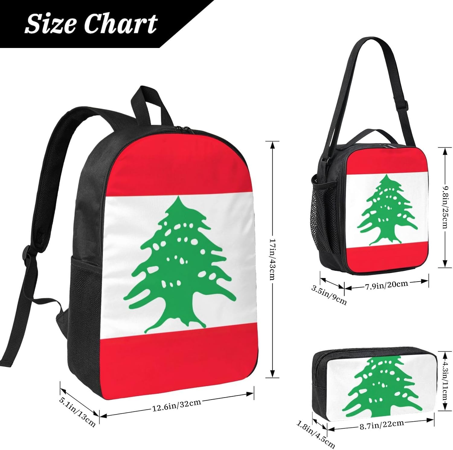 The Flag of Lebanon print Backpack with Lunch Bag, Pencil Case is made from robust Oxford fabric that provides a reliable and long-lasting performance for anyone who values functionality. The dimensions of the backpack (12.6x5.1x17 inches) allow for comfortable storage of your essentials, while the lunch bag keeps your food at the right temperature, perfect for day trips or outdoor activities. The pencil case offers a tidy solution for your writing materials, completing the set with added practicality and style for a variety of uses, from hikes to daily errands.
