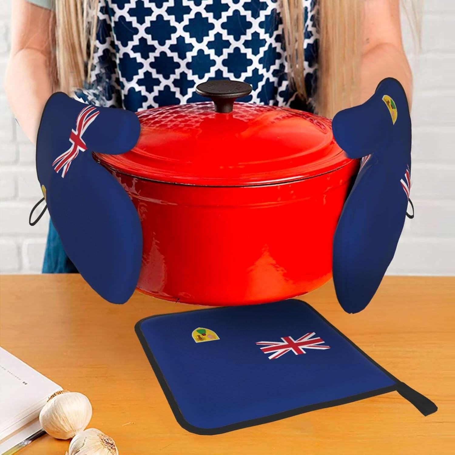 upgrade your kitchen safety with this Flag of the Turks and Caicos Islands print microwave gloves, oven mitts and pot holders sets. crafted from water repellency polyester and heat-resistant fabric, these kitchen baking three piece set offers reliable protection for hands while handling hot items. the double-layer waterproof design ensures easy cleaning after use. suitable for various cooking scenarios including microwave ovens, conventional ovens, stovetop cooking, and outdoor grilling. the side hanging rope allows convenient storage when not in use. the thick construction provides excellent heat insulation without compromising dexterity. this unisex kitchen essential combines functionality with practical design for everyday cooking needs. the heat-resistant gloves maintain comfort while offering superior protection against burns. an essential addition to any modern kitchen setup
