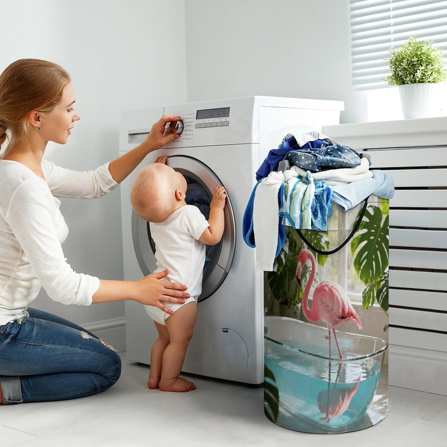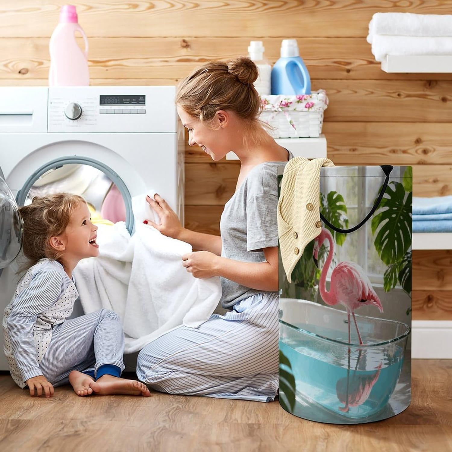The pattern of the Flamingo Whispers hamper is printed with exquisite patterns, which makes the product more attractive.Chic design allows it to be used in the living room to hold throw blanket, pillows, and reading materials, as well as in the bathroom for towels, or as a laundry hamper.The laundry hamper adopted collapsible design, equipped with handles. It is lightweight and portable for using, storing, and moving conveniently.Flamingo Whispers Clothes hamper is suitable to store dirty clothes washing, place in the room to store toys, and other household goods, keep the house clean and tidy. Perfect laundry hamper for home, office, closet organizer, bedroom, bathroom, college dorm, etc.Gets out of your way when you need it to. This storage basket or laundry hamper is a good gift, which not only meets everyday storage needs but also carries deep care and love, a perfect way to turn thoughtfulness into warmth.