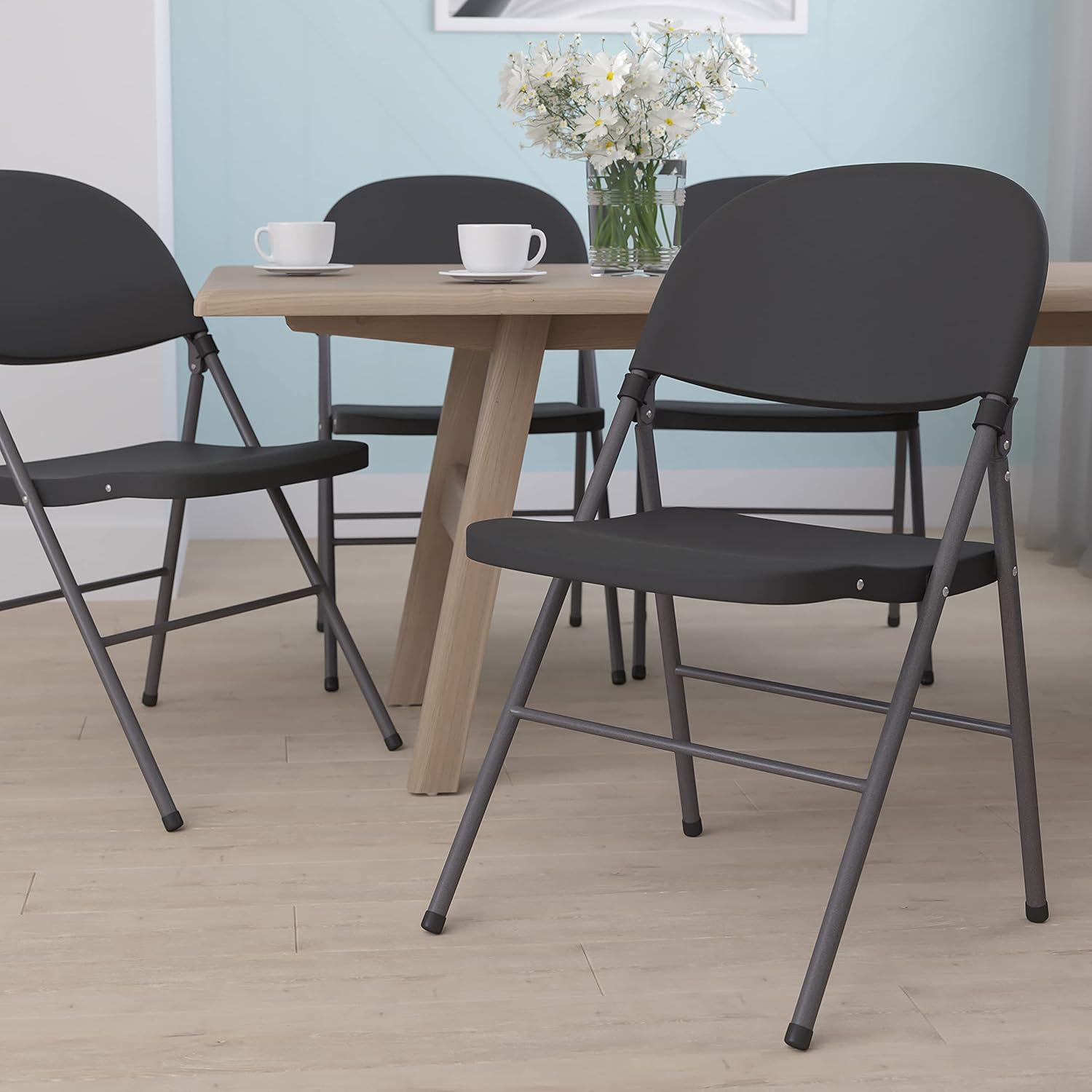 Always be ready for your next event or get-together with the Flash Furniture Hercules Series Folding Chairs. Whether you're hosting a game night or catering event, planning weddings or business meetings, or organizing a school function, these folding plastic chairs offer a reliable, on-demand seating solution for commercial or home use. The textured and molded plastic seats reduce slipping while providing superior comfort for your guests even during long events. The folding event chairs have an ultra-lightweight design. Constructed with durable plastic and gray powder-coated steel frame supports on the sides of the seat, these small folding chairs withstand years of quality use at indoor or outdoor events. Each guest chair measures 19"W x 22"D x 32.75"H open and 19"W x 4.5"D x 41"H folded with no assembly required, and they support up to 330 pounds of static weight. As needed, the low-maintenance chairs can be cleaned with a solvent and water-based cleaner such as foam.