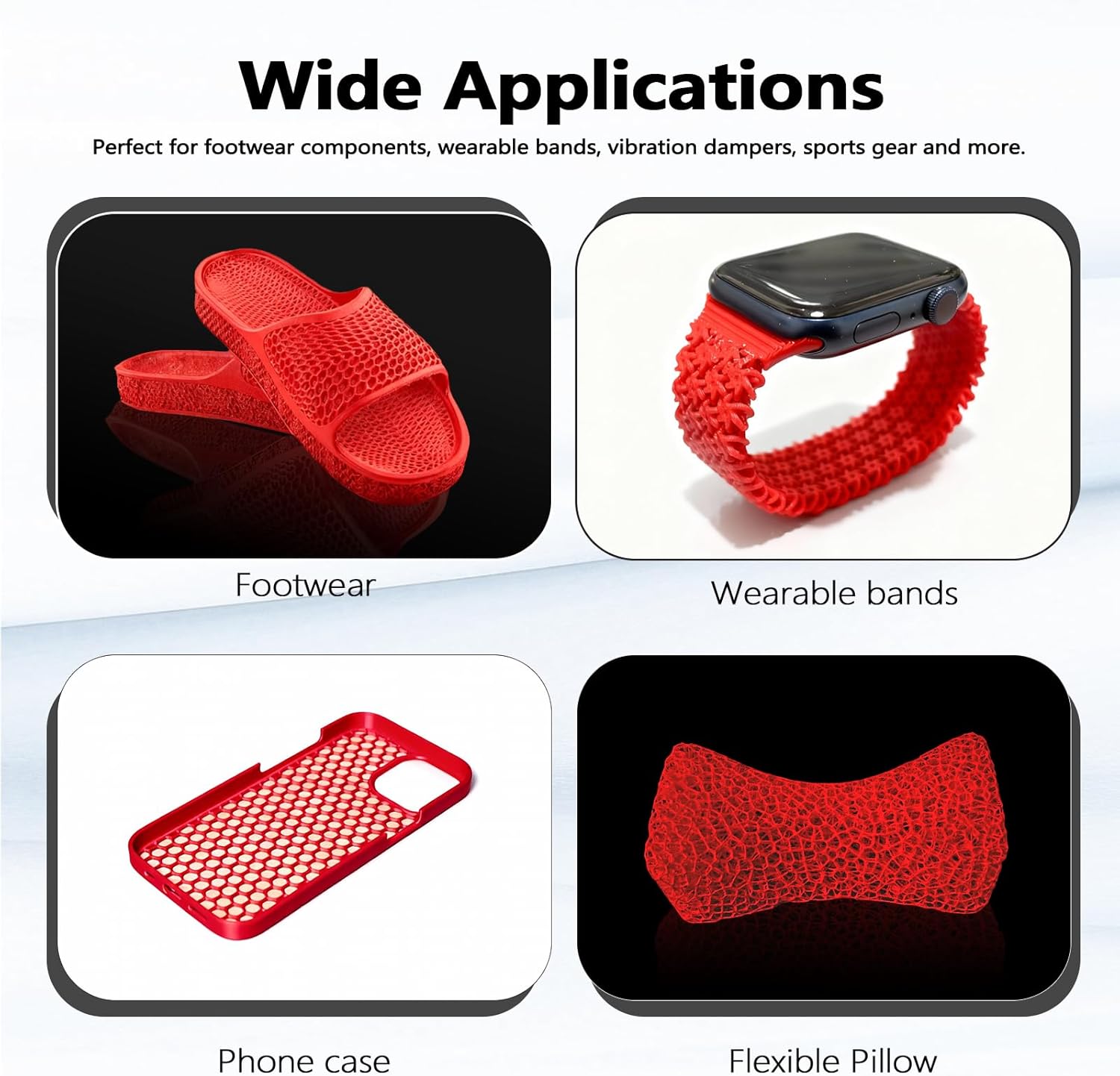 | Additional Features | Flexible, softens post-printing to ~70A Shore hardness |