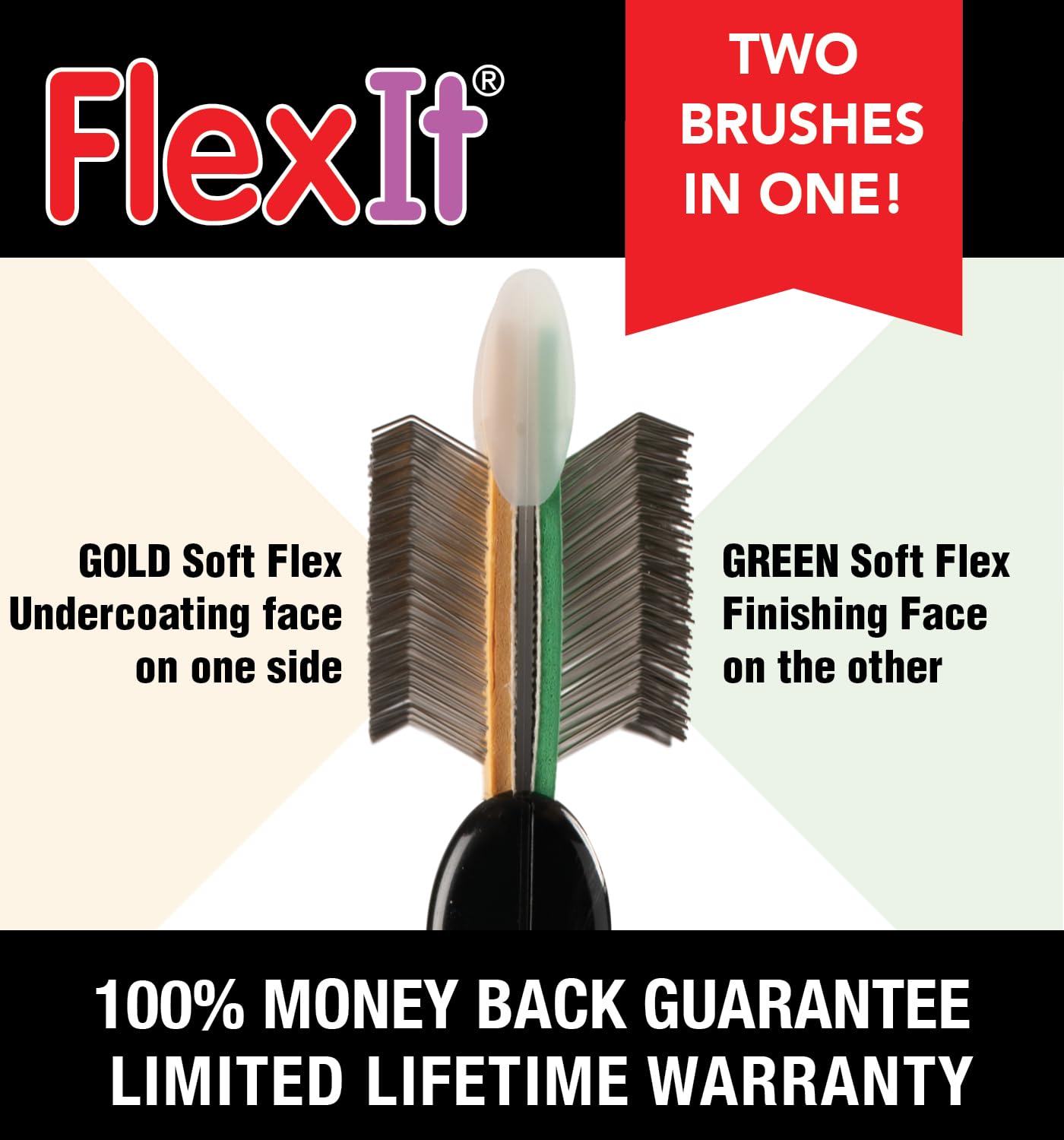 This FlexIt dog grooming brush is a combination of: 1. GREEN Soft Flex Finishing Brush 2. GOLD Soft Flex Undercoating Brush BREED SUGGESTIONS: BELGIAN SHEPHERD CAV COCKER SPANIEL COTON DE TULEAR DACHSHUND KING CHARLES MALTESE PAPILLION POMERANIAN ROTTWEILER SETTER YORKIE YOUNG DOGS. The FlexIt Green and Gold Soft Flex Finishing brush replaces the ActiVet brush and is particularly terrific for soft coated dogs with moderate undercoats, and shorter hair dogs that still need regular brushing. The Gold face gently removes undercoat where needed and then you can flip it over and use the Soft Green Finishing face to complete the job. This soft COMBO is an excellent brush to recommend to Home Groomers that need a more forgiving brush, but still need the benefits of a professional grade brush. COMBOS are two different brush types in one brush head, designed for applications that would normally require you to buy two brushes.
