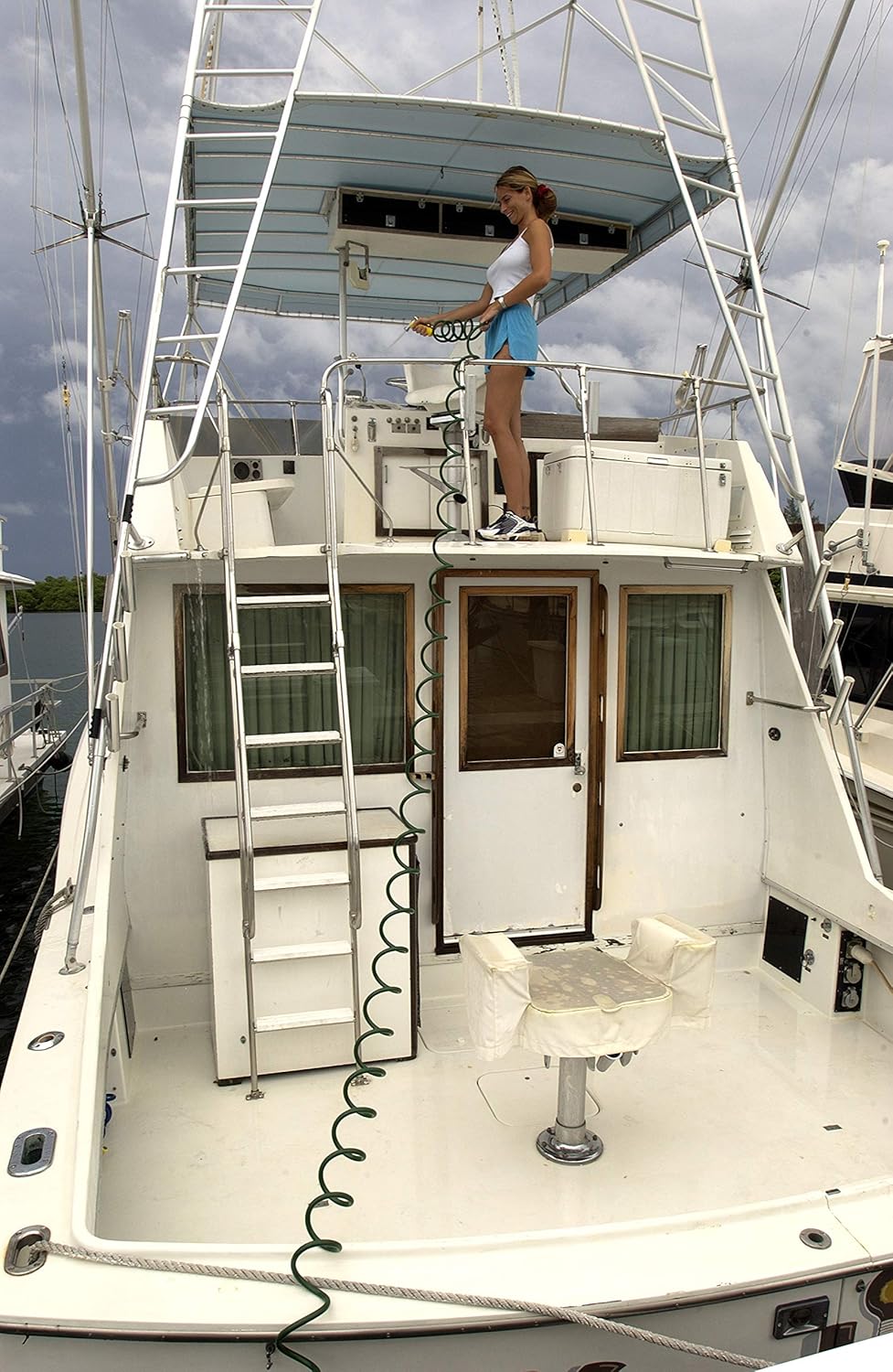 Coil spring hose protector with solid brass compression couplings. Weather resistant cover and U.V. resistant.
