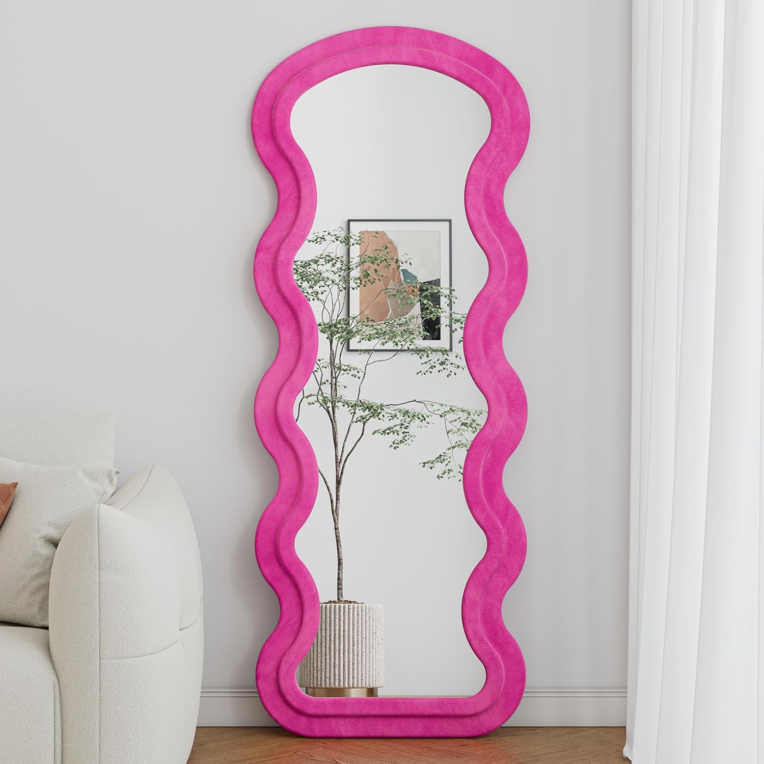 Looking for a mirror that combines modern design with luxurious comfort?This cream white full-length mirror with a wavy design features high-quality flannel fabric and sponge padding, making it not only a functional piece but also an elegant addition to any room. Its soft touch and sleek appearance will elevate the style of your living room, bedroom, or dressing room.Worried about image distortion or fabric fading?You can rest assured that this mirror offers a 1:1 true reflection without stretching or warping the image, even over time. Plus, the flannel fabric won’t fade, ensuring long-lasting beauty. The durable back panel adds extra strength, so you don’t have to worry about cracks or deformations.Concerned about safety?This mirror is designed with a shatterproof feature that protects you and your family from harmful splinters in case of accidental damage. Its thickened construction ensures durability and stability, making it a safe choice for any household.Looking for a versatile design that fits any space?This mirror works perfectly in a variety of settings, from your bedroom and living room to your dressing room. Whether standing freely or mounted on the wall, its modern design and choice of two colors allow it to blend seamlessly with your interior decor.Need something easy to use and move?With a support frame on the back, this full-length mirror can stand securely on its own or be hung on the wall for space-saving convenience. Lightweight and portable, it’s easy to adjust and position wherever you need it.Product Details:Size: 65'' H x 22'' WColor: Cream WhiteFrame: Wooden with flannel fabric coverReflection: 1:1 real reflection, distortion-freeBack Panel: Thickened, anti-crack designSupport: Standing frame or wall mount optionsPlease Note:Slight color variations may occur due to screen settings. Assembly instructions are included for easy setup.