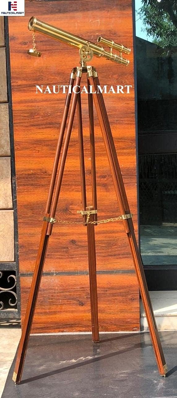 Dimensions: 18" L x 15" W x 45" H The Astro Griffith Brass Telescope 44" with view finder is a beautiful solid brass refractor telescope mounted on a wooden tripod. This telescope is a fully functioning nautical masterpiece that can given as a gift for any occasion, or used to decorate your home, office or boat, a solid brass nautical gem that adds a shine to any room it graces. Both the telescope and viewfinder are solid brass, with up to 12x magnification, and focusing is accomplished by adjusting the eyepiece ring on the telescope tube. A removable brass cap, connected by a chain, protects the objective lens when not in use. The wooden tripod stand features smooth, polished round legs, each with solid brass fittings and a screw release to let you adjust the height. A solid brass chain holds the three wooden legs together so the telescope can maintain its position.