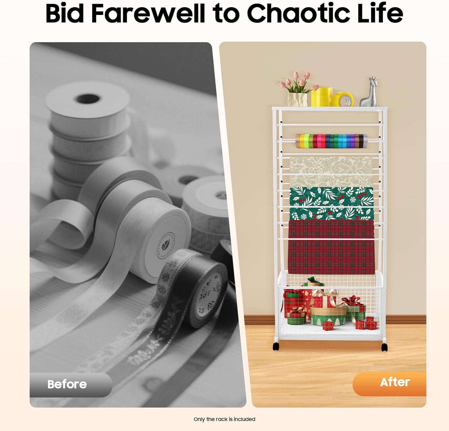 Description Blooming the brilliance of every tier, all in our ribbon organizer rack! This is a combination of efficient storage and artistic display. Selected materials, reasonable structure, and universal wheel design allow you to achieve stable and flexible use. Creating efficient packaging starts with upgrading storage racks! Details Adjustable Wheels: Their height can be adjusted slightly, making the product adapt to uneven ground for higher stability. Slots: They can firmly hold the crossbars to ensure stability during use while also allowing for convenient adjustment of tier spacing. Specification Color: Black/White Style: Modern Shape: Rectangular Material: Iron Process: Baking Paint Assembly Required Yes Mount Type: Freestanding Number of Tiers: 16(Double-sided) Wheel Type: 4 * Lockable Universal Wheels Overall Max. Load-Bearing Capacity: 50kg/110.23lbs Basket Height: 33cm/12.99in Product Size: 67*32*150cm/26.38*12.6*59.06in Package Size: 75*42*12cm/29.53*16.54*4.72in Gross Weight: 10kg/22.05lbs Net Weight: 9kg/19.84lbs Package Included 1 * Ribbon Organizer Rack 4 * Lockable Universal Wheels 1 * English Diagram Other Accessories for Assembly Notes 1.Please carefully check the product size before purchasing. 2.The ribbons, flower wrapping papers, and other items in the picture are not included in the package. 3.Please allow the slight color difference caused by the shooting light and 1-3cm error due to manual measurement, and make sure you do not mind before ordering.