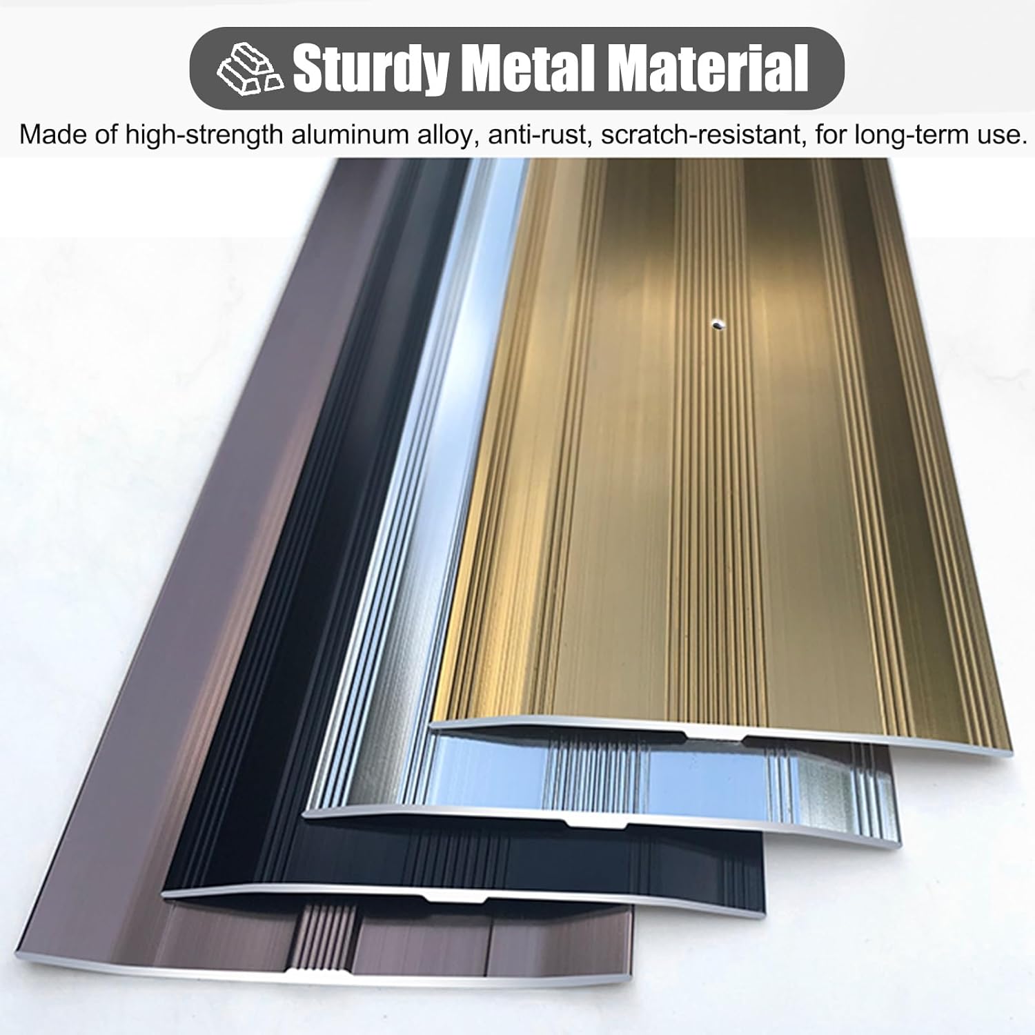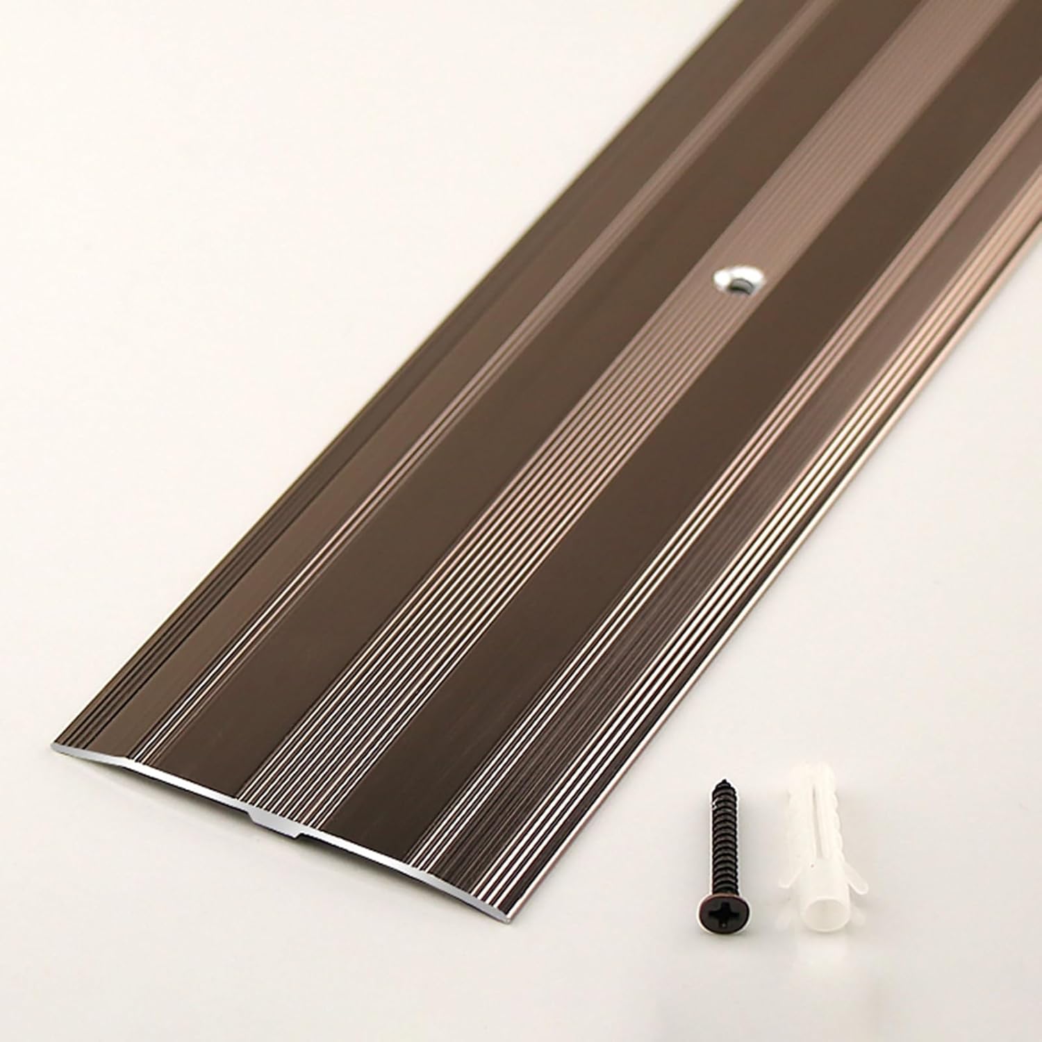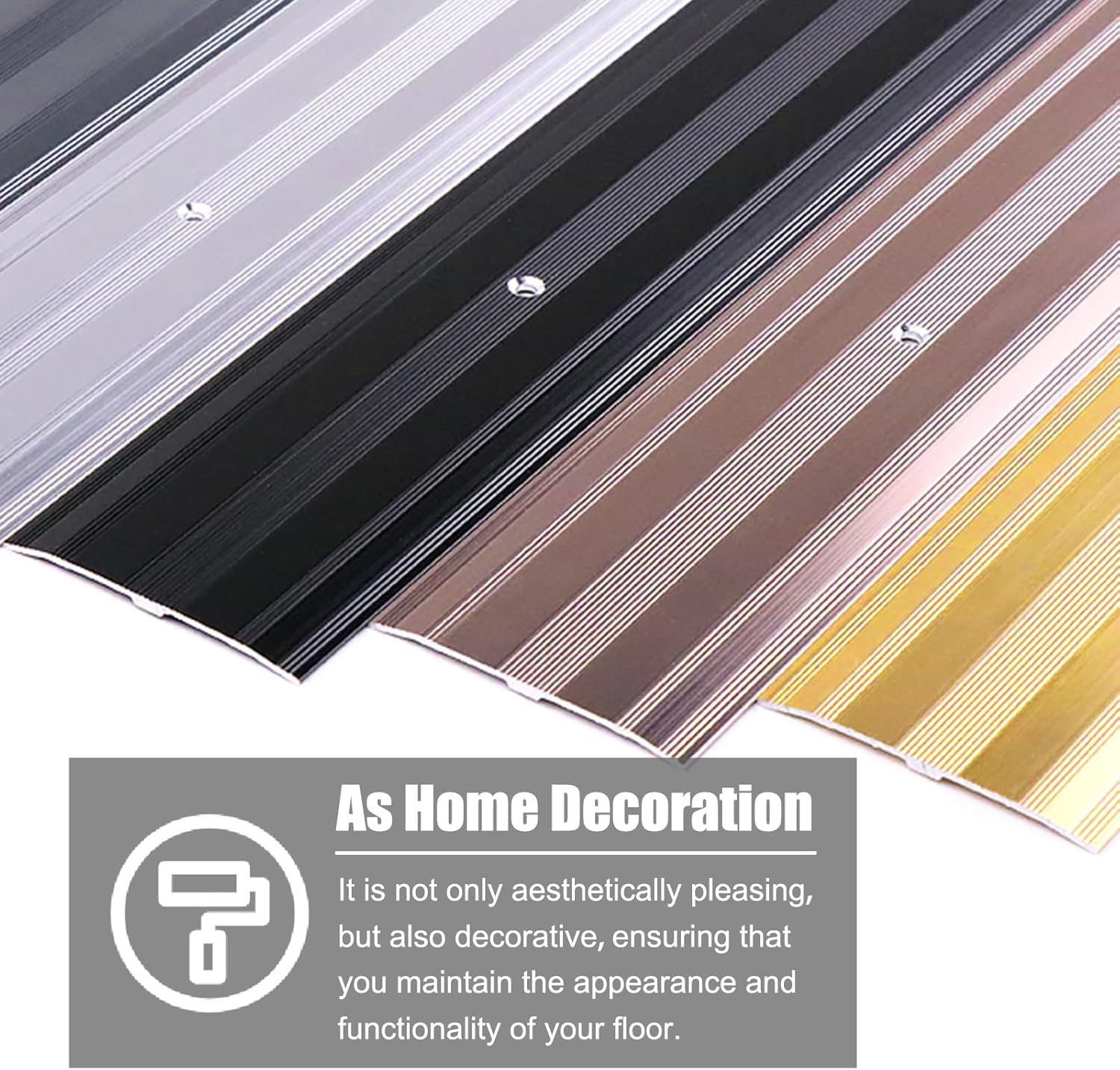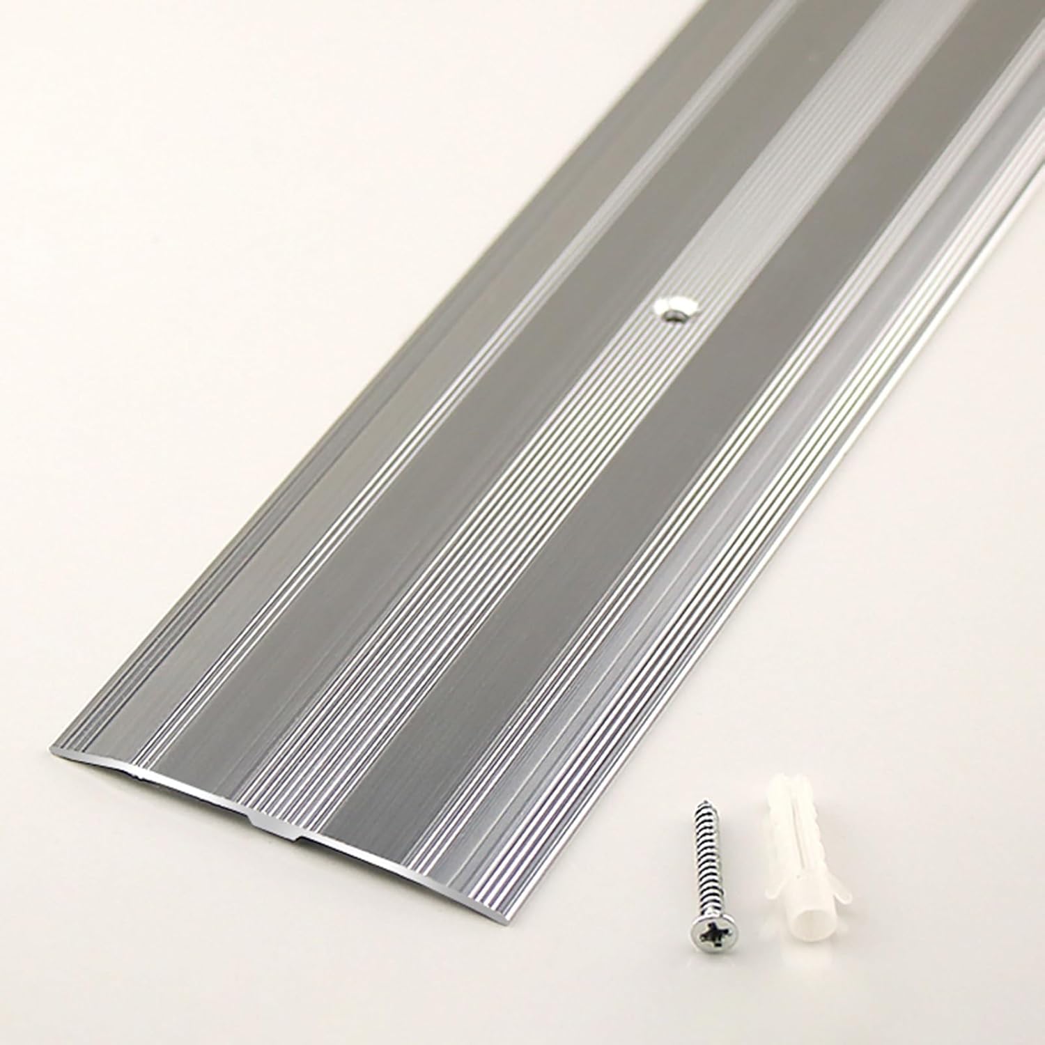 Convenient for you and your family, our inserts are the choice to create beauty and provide safety. Package Contents: - 1 x Floor Divider Strip - 4 x Screws Specifications: - Material: aluminum alloy - Length: 90 cm (35 3/8 inches) - Width: 6 cm (2 3/8 inches) - Thickness: 1.2 mm (1/16 inch) Features: - Non-slip surface design. - Durable metal for long term use. - The reserved holes are easy to install. - Easy to clean and maintain, will not fade. - Cut the trim strip to the desired length with a hacksaw. - Matte design is beautiful and blends in with any decor. - Provides a smooth transition between different flooring materials for wheelchairs.