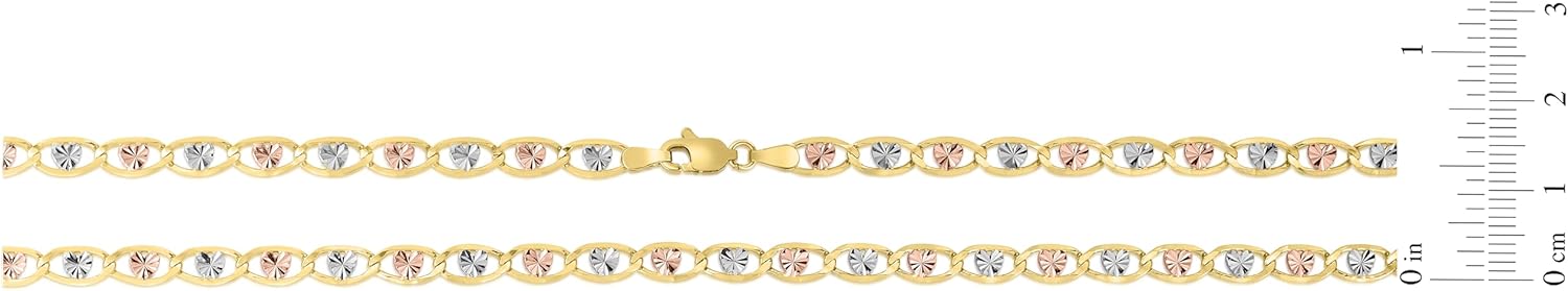 Jewelry Type — Bracelet/AnkletStyle — Valentino HeartMetal Type — GoldMetal Color — Tri-Tone GoldGold Karat — 10kSolid/Hollow — SolidClosure — Lobster ClawWidth — 4.3 millimetersVariations — 7", 8" or 10 InchesWeight (approx.) — 7 Inch: 3.4 grams8 Inch: 3.9 grams10 Inch: 4.5 grams