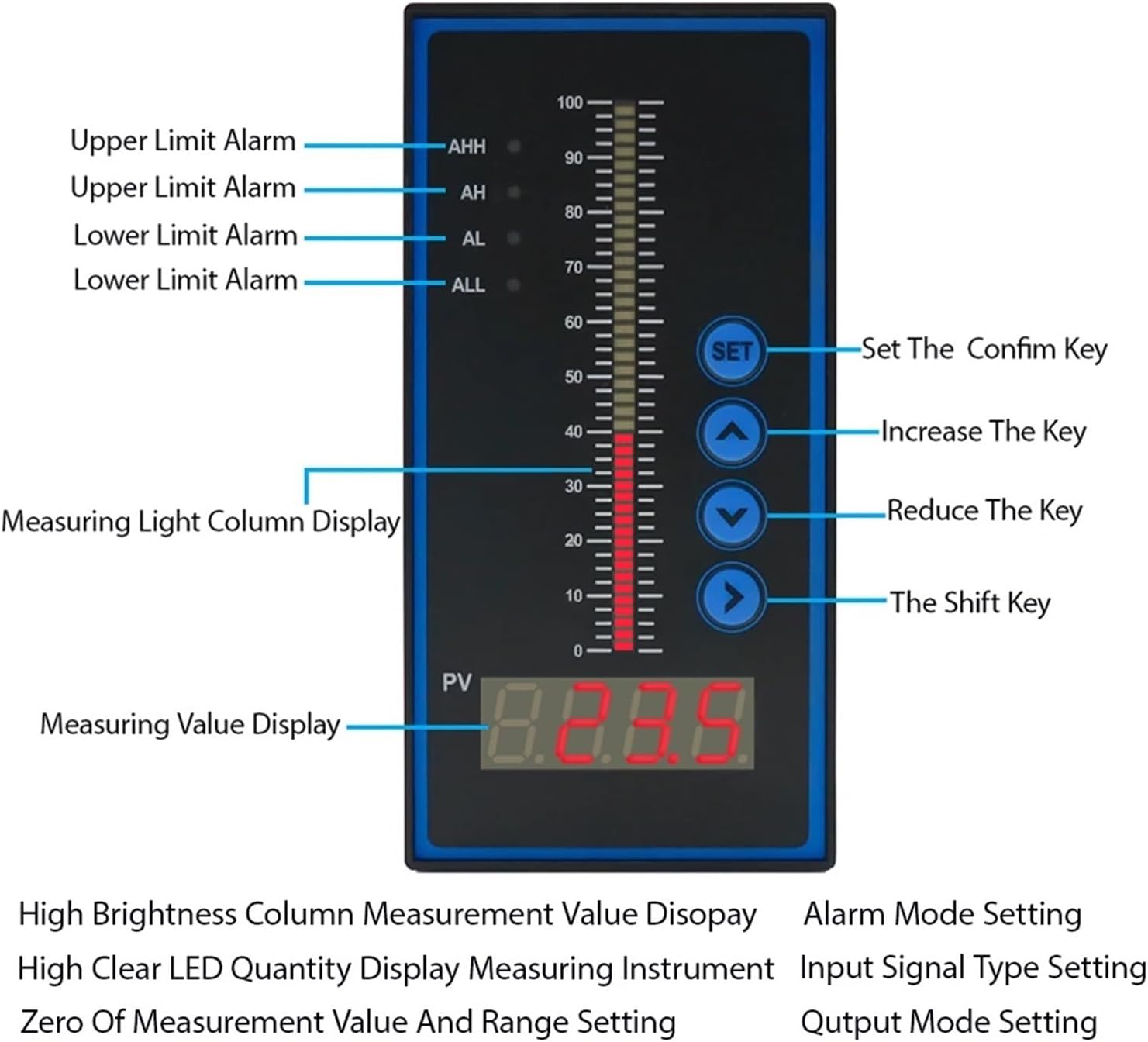 Features:Compact structure, strong, easy installation and use, Can cooperate with digital display output instructionsSpecification:Model: T80Input: Universal InputMeasuring medium: liquidWeight: Approx.521g/18.4ozPackage list:1 x Light Column DisplayInput Signal : 4~20mAOutput Signal : Relay on-off SignalPrecision : 0.5 ClassMeasuring Range : -999~9999Power Consumption : 3WLoad Power : 200W(Resistive Load)