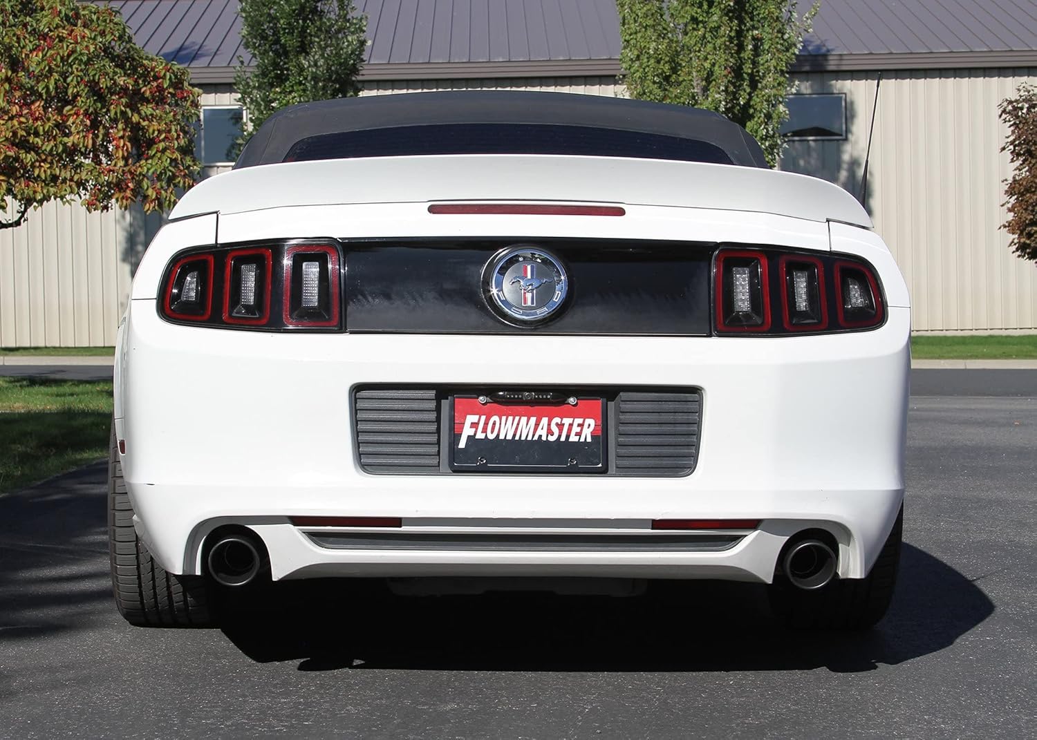 Fits 2011-2014 Ford Mustang 3.7-liter, Flow FX Axle-Back 2.5-inch Stainless Steel Exhaust System, 4.0-inch Black Ceramic Tips, Dual Out Rear Exit. Flowmaster introduces our Flow FX stainless steel axle-back exhaust system for the 2011-2014 Ford Mustang with the 3.7-liter engine. This system uses a Flow FX series muffler for a moderate to mild sound level and increased performance. Mandrel bent 2.5-inch 409 stainless steel tubing allows for maximum exhaust flow and durability. The system uses larger 4.00-inch black ceramic-coated stainless steel tips for a custom look. Max dyno gains of 7 hp and 6 lb-ft at the rear wheels over stock. All of the necessary hardware is included, and factory-mounting locations are used for an easy installation. Backed by Flowmaster's Lifetime Limited Warranty.